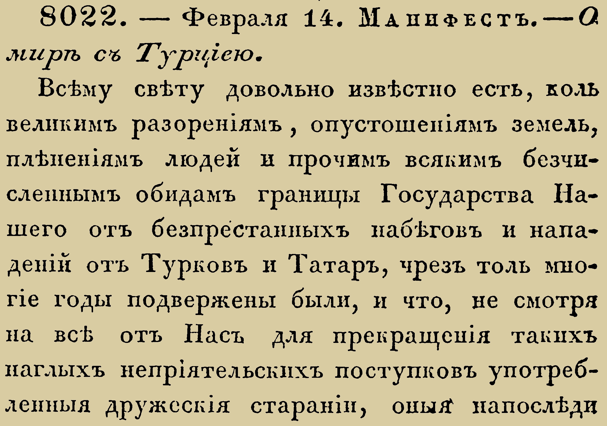 Всевышній Богъ, который уповающихъ на Него не оставляетъ, сіе Наше праведное желаніе исполнилъ. Война прекращена въ благополучной миръ, и непріятельства возстановленною дружбою и тишиною пресѣчены. По общему съ Портою Оттоманскою соглашенію миръ съ оною въ седмый день Сентября минувшаго года заключенъ, а въ седмый на десять день Декабря того же года, чрезъ размѣненіе съ обѣихъ сторонъ Ратификацій, которое въ Константинополѣ съ отмѣннымъ торжествомъ и съ надлежащими церемоніями учинилось, въ совершенство и во утвержденіе свое приведенъ.