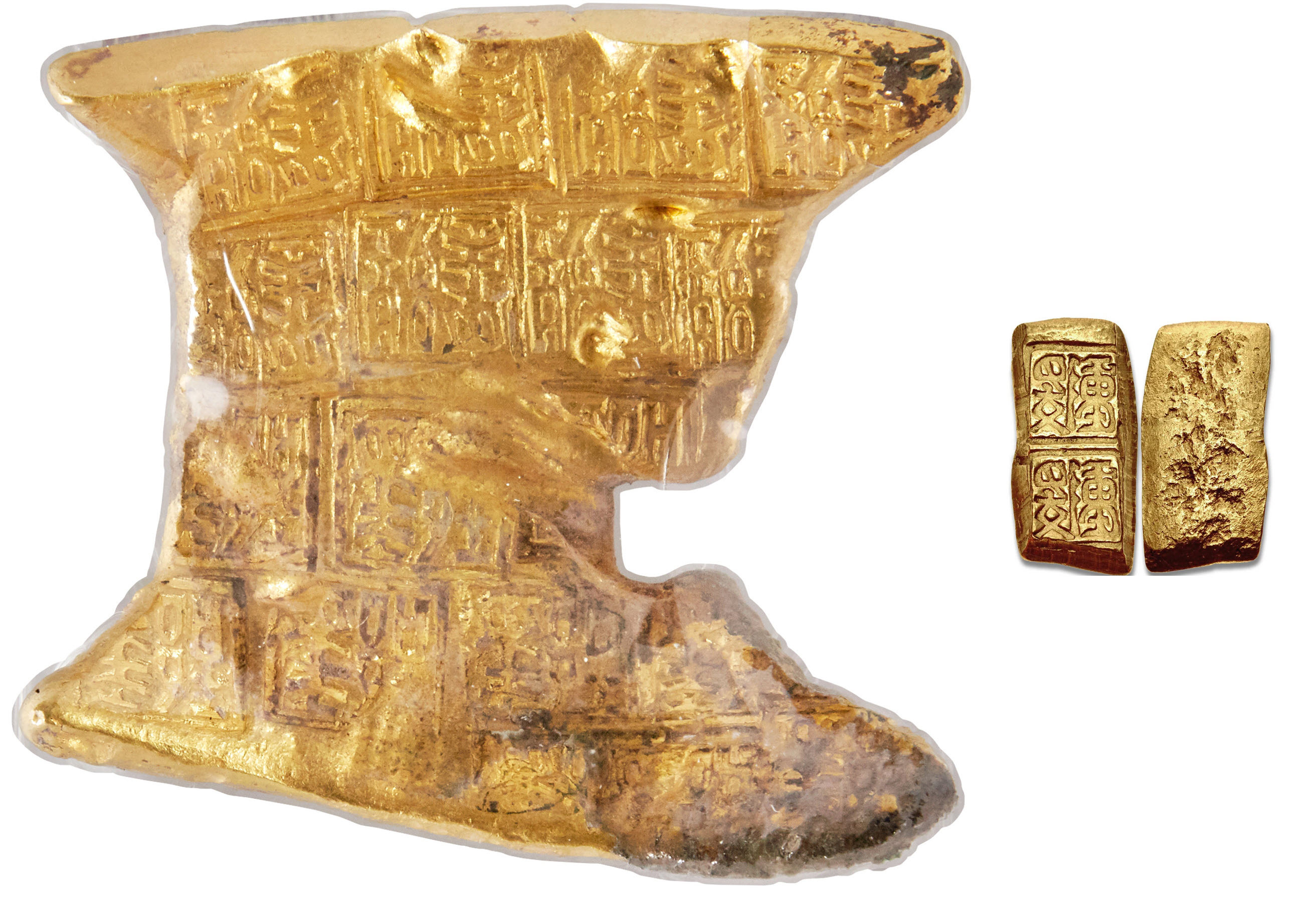 Слева - блочные или кубические деньги Yǐng Yuán. Справа двойной слиток царства Чу
