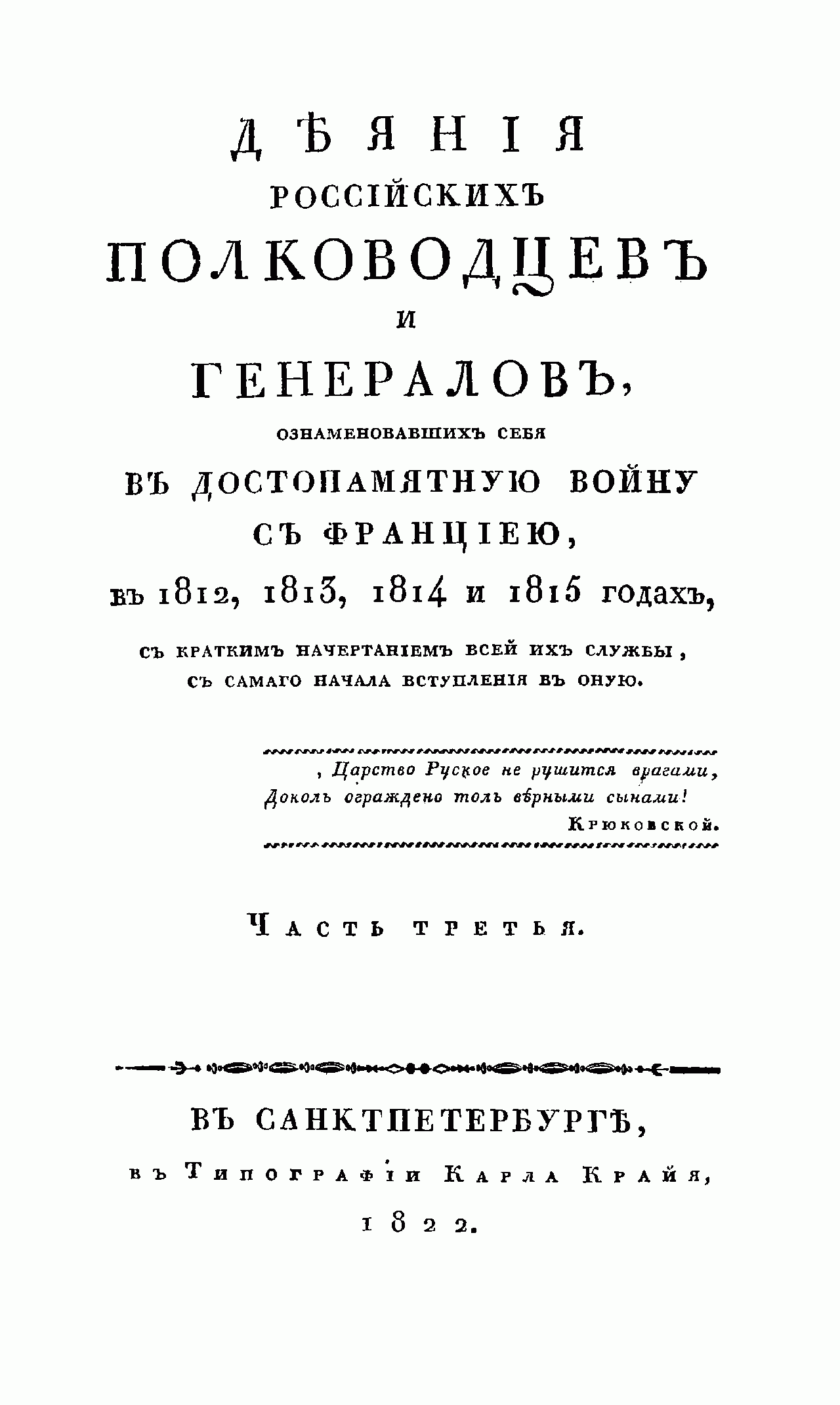 Деяния российских полководцев и генералов, ознаменовавших себя, в достопамятную войну с Францией, в 1812, 1813, 1814 и 1815 годах. Часть третья
