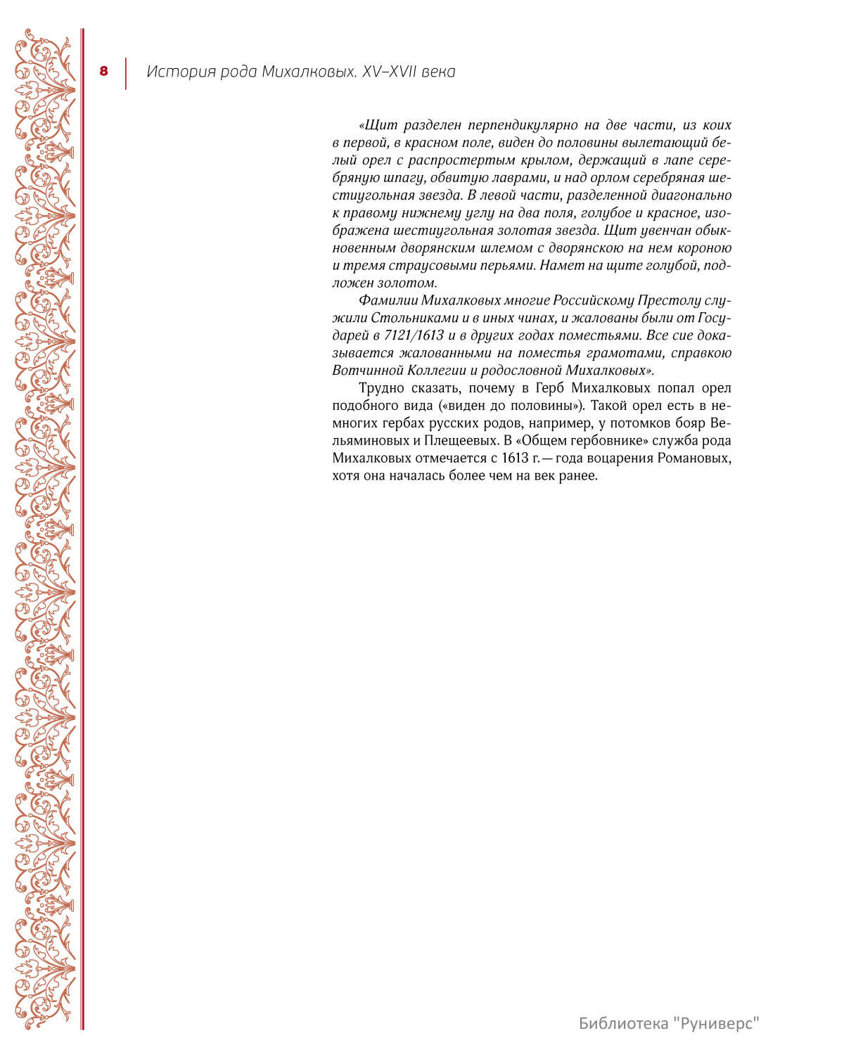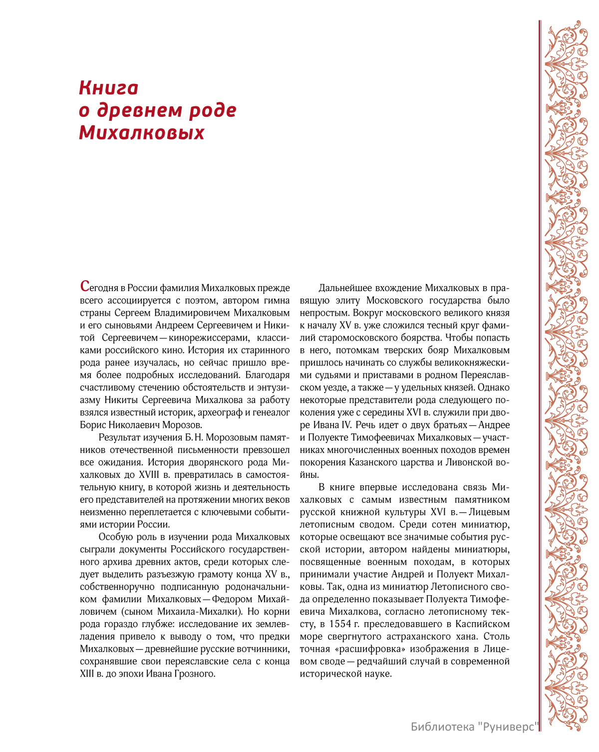 В результате исследова-ния автору удалось доказать более древние корни рода — Михалковы являются потомками не только тверских бояр XIV–XV вв., но и древнейших вотчинников Переяславского княжества. В XVI в. представители рода Михалковых вошли в придворную элиту, a в начале XVII в., будучи в родстве с новой царской династией Романовых, приложили много усилий для восстановления разоренного дворцового хозяйства. Автором впервые вводятся в научный оборот сведения о роли Михалковых и их родичей Салтыковых в развитие русской культуры в 1610-е гг., в том числе в возрождение русского книгопечатания в Московском Кремле. Разнообразные документы из архива Михалковых второй полови-ны XVII в., в том числе частные письма — «грамотки», позволили Б. Н. Морозову подробно описать участие стольника Д. В. Михалкова (предка ныне живущих представителей рода) во всех военных походах того времени, а также — его частную, семейную жизнь.<br>