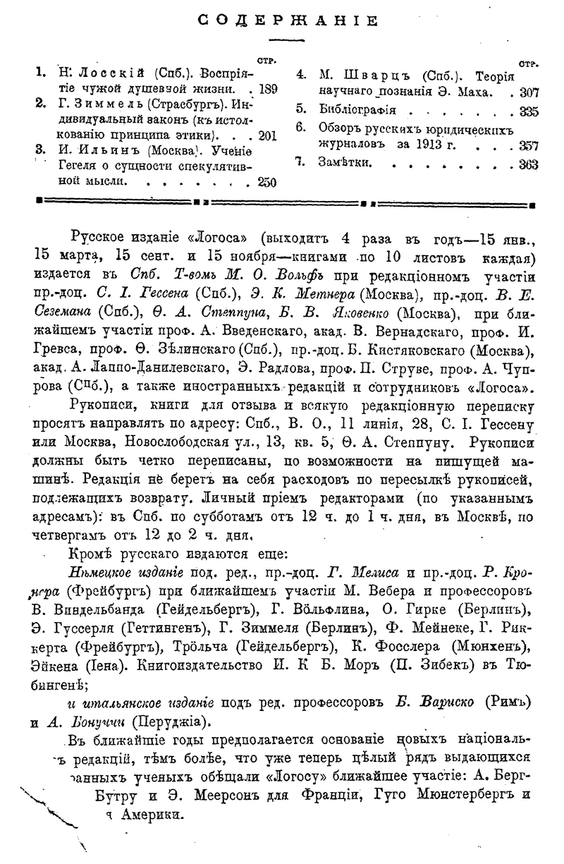 вышли из журнала. В русской версии «Логоса» участвовали и иностранные философы: Г. Зиммель, Г. Риккерт, Р. Кронер, Г. Вёльфлин, B. Виндельбанд, Н. Гартман, П. Наторп, Б. Кроче, Э. Бутру.