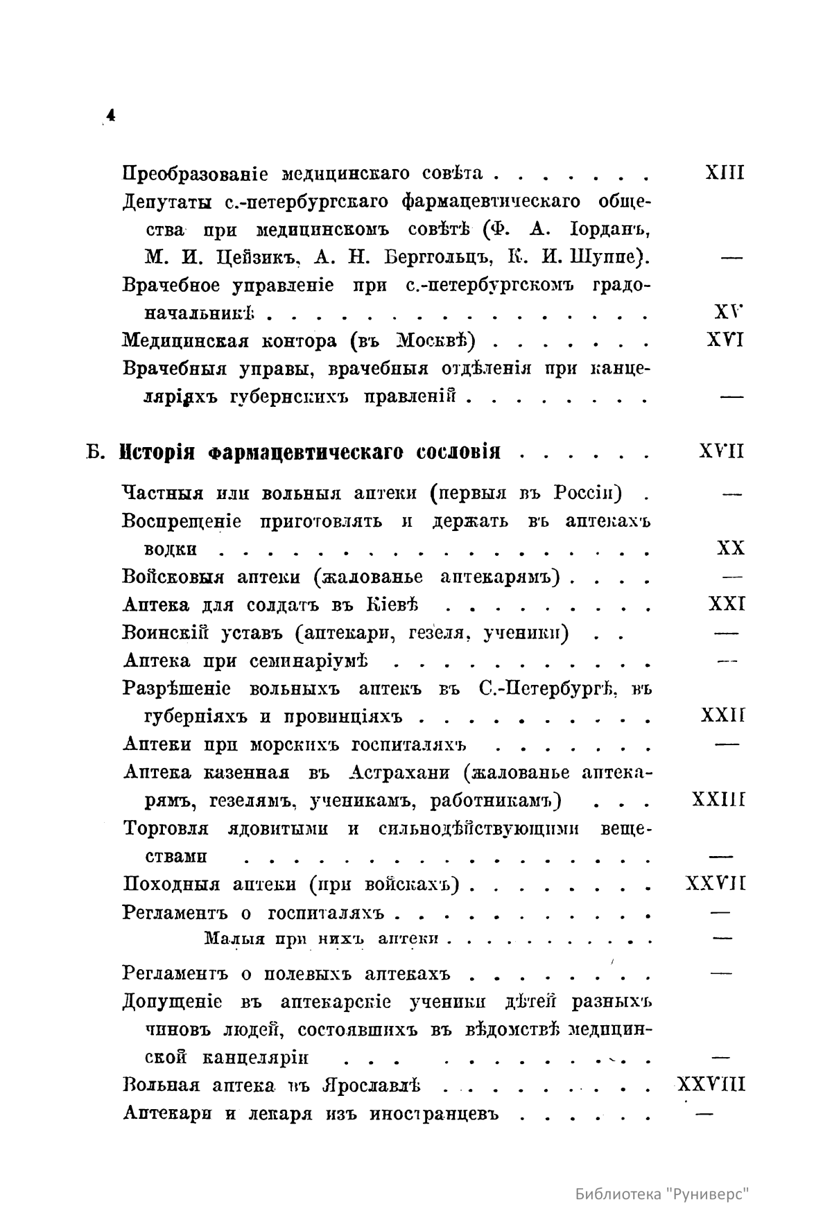 • Учреждение и устройство аптек: Приведены правила открытия новых аптечных заведений, нормы по количеству жителей и рецептов на одну аптеку, а также требования к внутреннему устройству помещений (лабораторий, материальных комнат, ледников),,,.
