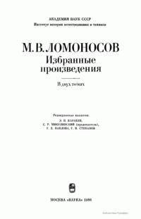 Данное двухтомное собрание избранных произведений великого российского ученого и просветителя М.В. Ломоносова, включающего его основные труды в области естественных наук и философии, а также истории, филологии и поэзии, было приурочено к 275-летию со дня его рождения. Как указывается в предисловии, авторы-составители подготовили к выпуску в свет данное издание таким образом, чтобы наиболее полно и рельефно дать читателю представление об органичном единстве взглядов великого ученого-патриота в кажущихся совершенно различными областях знаний. Именно благодаря энциклопедическим воззрениям Ломоносова и его подлинно национальном мировоззрении в развитии научного творчества, открытия великого ученого-реформатора порой выглядят гениально просто и одновременно взаимосвязано. Взгляды Ломоносова на развитие научных знаний, воспитании всесторонне образованных ученых, обладающих необычайной широтой познаний не только в сфере науки, но и литературы, поэзии и искусства, при этом беззаветно преданных России, и поныне являются актуальными и весьма значимыми для отечественной науки.