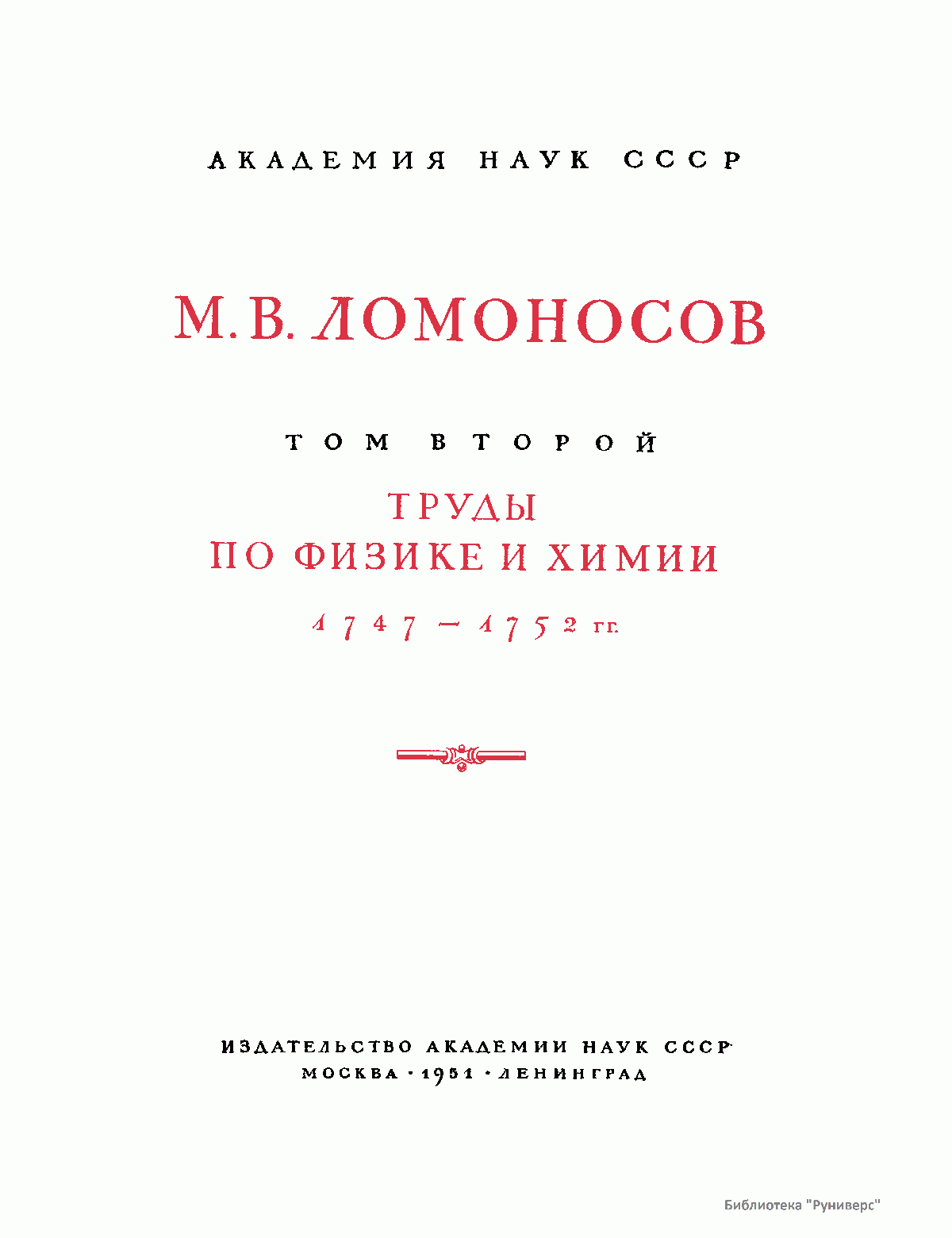 Михаил Васильевич Ломоносов – человек необъятных дарований и научной энергии, величайшей деятель культуры XVIII века, лучший продолжатель идей петровского времени. Ломоносов работал в области всех известных в его время наук и почти в каждой сделал замечательные открытия. Он был философом, физиком, химиком, металлургом, географом, биологом, астрономом, филологом одновременно. В этом отношении Ломоносов был последним представителем фаланги великих людей, выдвинутых во всей Европе эпохой Возрождения, людей типа Леонардо да Винчи или Галилея. Белинский так писал о Ломоносове: «Ослепительно и прекрасно было это явление. Оно доказало собой, что человек есть человек во всяком состоянии и во всяком климате, что гений умеет торжествовать над всеми препятствиями, какие ни противопоставит ему враждебная судьба, что, наконец, русский способен ко всему великому и прекрасному». Настоящее издание сочинений Ломоносова наиболее полное из всех. Оно подготовлено на основе большой работы ученых по разысканию, описанию и изучению разнообразного и богатейшего научного наследия Ломоносова. В издание включается несколько сот документов, не вошедших в последнее академическое издание и ранее не опубликованных. В число этих документов входит ряд статей и заметок научного значения, автобиографически документы, переводы и разнообразные служебные бумаги, характеризующие Ломоносова как выдающегося организатора русской науки и просвещения XVIII века. Особо следует отметить документы, относящиеся к деятельности Ломоносова как ученого-экспериментатора. Все публикуемые тексты сверены с первоисточниками – рукописями и прижизненными изданиями. В отдельных случаях, когда ни рукописей, ни прижизненных изданий не сохранилось, текст печатается по наиболее достоверному, критически изученному источнику. Произведения печатаются по новой орфографии с заменой пунктуации Ломоносова современной пунктуацией, но с сохранением, по возможности, всех особенностей, присущих языку Ломоносова. Все тексты, написанные на латинском языке, печатаются одновременно на языке оригинала и в русском переводе. Произведения Ломоносова распределены по разделам его деятельности. Каждому разделу посвящен один том или несколько томов, в зависимости от объема материала. В пределах каждого тома произведения расположены хронологически по времени их написания или публикации. Некоторые отступления от этого принципа сделаны лишь в отдельных случаях, когда это вызывалось необходимостью сохранить органическую связь между однородными произведениями. В отличие от старых изданий сочинений Ломоносова, в которых при распределении материала сначала печатались художественные произведения и филологические труды, в настоящем издании первые тома посвящены научным трудам по физике, химии и другим естественным наукам. В конце каждого тома даются краткие примечания справочного характера к опубликованным в томе работам и указатель личных имен. Настоящее полное собрание сочинений Ломоносова осуществляется Главной редакцией издания при непосредственном участии Комиссии по истории Академии Наук СССР, архива Академии Наук СССР и приглашенных специалистов.