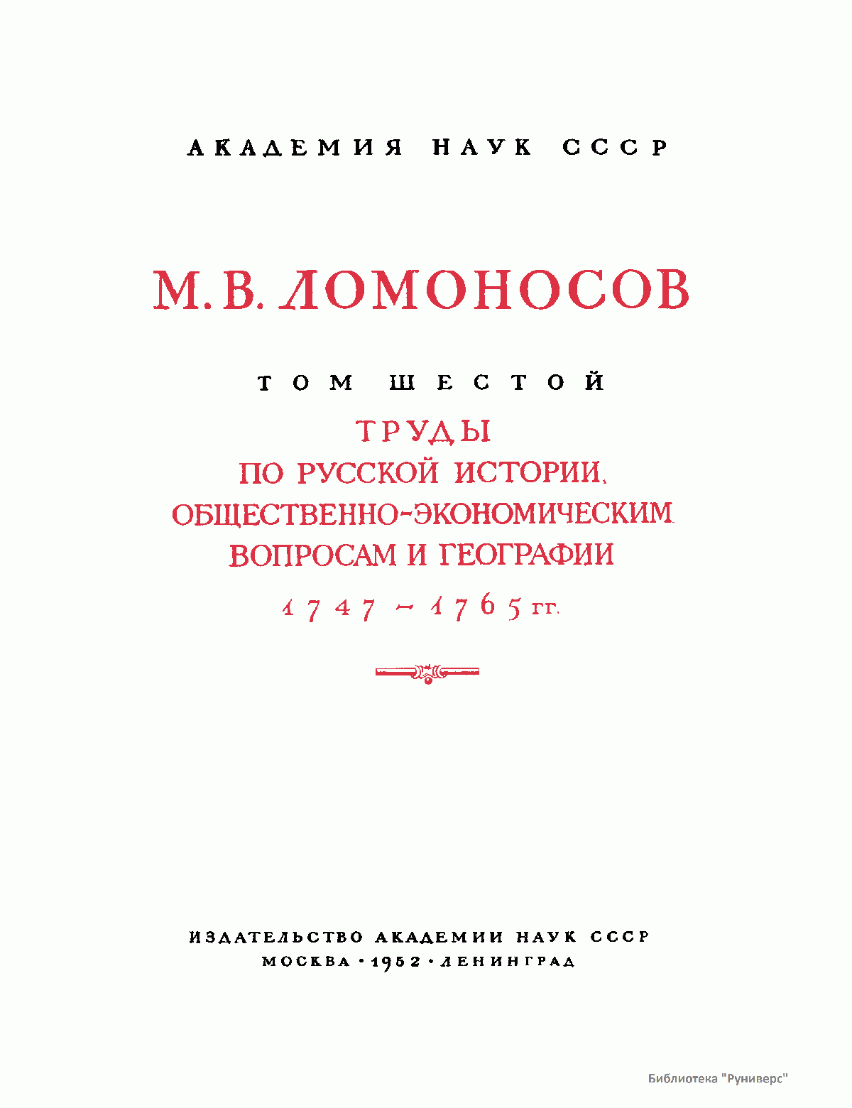 Михаил Васильевич Ломоносов – человек необъятных дарований и научной энергии, величайшей деятель культуры XVIII века, лучший продолжатель идей петровского времени. Ломоносов работал в области всех известных в его время наук и почти в каждой сделал замечательные открытия. Он был философом, физиком, химиком, металлургом, географом, биологом, астрономом, филологом одновременно. В этом отношении Ломоносов был последним представителем фаланги великих людей, выдвинутых во всей Европе эпохой Возрождения, людей типа Леонардо да Винчи или Галилея. Белинский так писал о Ломоносове: «Ослепительно и прекрасно было это явление. Оно доказало собой, что человек есть человек во всяком состоянии и во всяком климате, что гений умеет торжествовать над всеми препятствиями, какие ни противопоставит ему враждебная судьба, что, наконец, русский способен ко всему великому и прекрасному». Настоящее издание сочинений Ломоносова наиболее полное из всех. Оно подготовлено на основе большой работы ученых по разысканию, описанию и изучению разнообразного и богатейшего научного наследия Ломоносова. В издание включается несколько сот документов, не вошедших в последнее академическое издание и ранее не опубликованных. В число этих документов входит ряд статей и заметок научного значения, автобиографически документы, переводы и разнообразные служебные бумаги, характеризующие Ломоносова как выдающегося организатора русской науки и просвещения XVIII века. Особо следует отметить документы, относящиеся к деятельности Ломоносова как ученого-экспериментатора. Все публикуемые тексты сверены с первоисточниками – рукописями и прижизненными изданиями. В отдельных случаях, когда ни рукописей, ни прижизненных изданий не сохранилось, текст печатается по наиболее достоверному, критически изученному источнику. Произведения печатаются по новой орфографии с заменой пунктуации Ломоносова современной пунктуацией, но с сохранением, по возможности, всех особенностей, присущих языку Ломоносова. Все тексты, написанные на латинском языке, печатаются одновременно на языке оригинала и в русском переводе. Произведения Ломоносова распределены по разделам его деятельности. Каждому разделу посвящен один том или несколько томов, в зависимости от объема материала. В пределах каждого тома произведения расположены хронологически по времени их написания или публикации. Некоторые отступления от этого принципа сделаны лишь в отдельных случаях, когда это вызывалось необходимостью сохранить органическую связь между однородными произведениями. В отличие от старых изданий сочинений Ломоносова, в которых при распределении материала сначала печатались художественные произведения и филологические труды, в настоящем издании первые тома посвящены научным трудам по физике, химии и другим естественным наукам. В конце каждого тома даются краткие примечания справочного характера к опубликованным в томе работам и указатель личных имен. Настоящее полное собрание сочинений Ломоносова осуществляется Главной редакцией издания при непосредственном участии Комиссии по истории Академии Наук СССР, архива Академии Наук СССР и приглашенных специалистов.