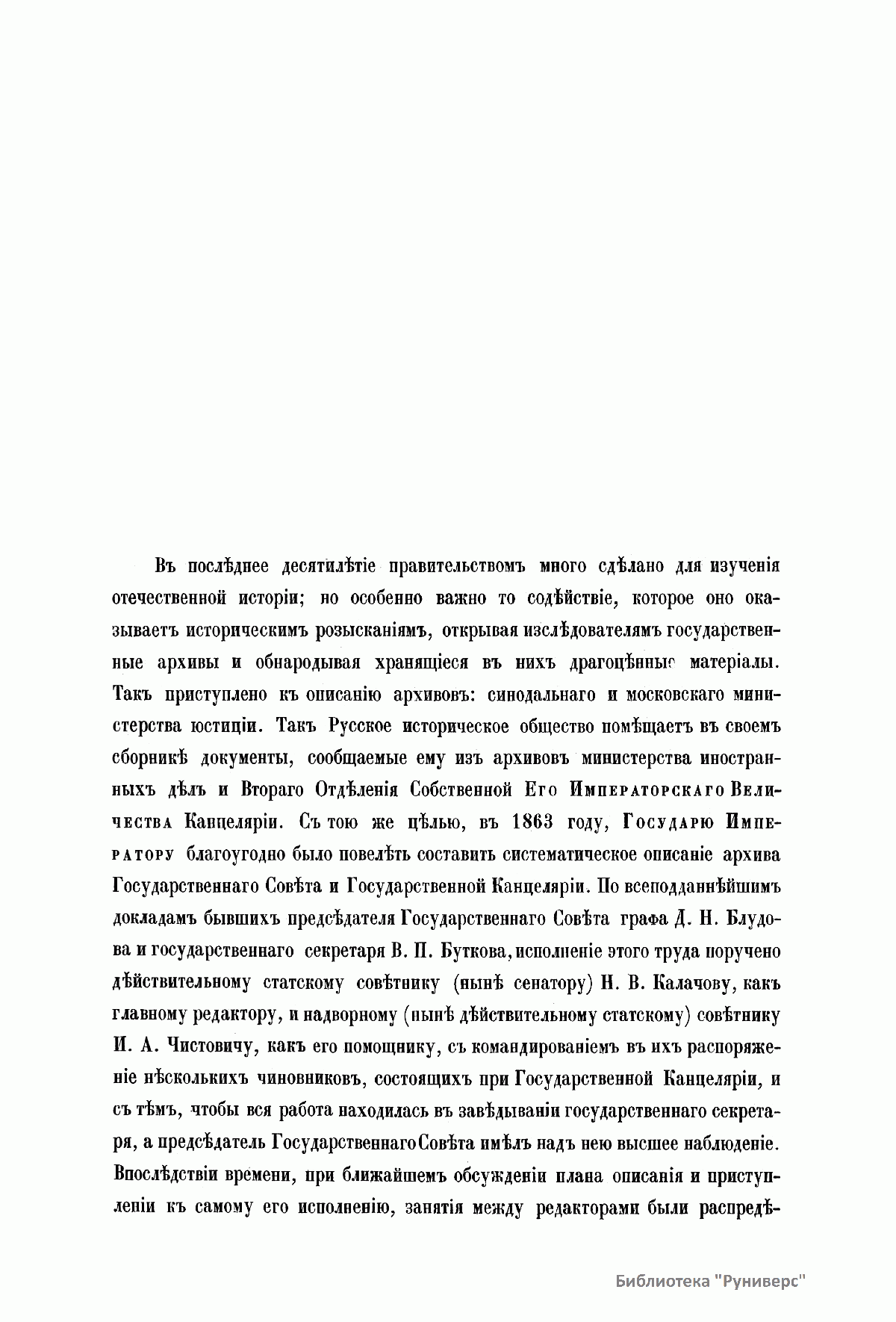 В 1863 г. по высочайшему повелению Александра II началась работа над систематическим описанием архива Государственного совета и Государственной канцелярии. Эта работа была поручена сенатору, историку-юристу Н. В. Калачову и советнику И. А. Чистовичу под высшим наблюдением председателя Государственного совета Д. Н. Блудова. Под их редактурой вышли в свет три тома (восемь книг) «Архива государственного совета»: две части первого тома, охватывающие период с 1768 по 1796 г. и заключающие в себе протоколы Совета, учрежденного императрицей Екатериной II; две части четвертого тома, содержащие журналы Государственного совета по Департаменту законов с 1810 по 1825 г.; две части третьего тома, в которые вошли протоколы Совета при Высочайшем дворе с 1801 по 1810 г.; две части четвертого тома, включающие журналы Государственного совета по Департаменту экономии с 1810 по 1825 г. Со смертью главного редактора издания сенатора Калачова публикация архива была приостановлена. С учетом исторической ценности данного труда, в 1886 г. последовало высочайшее повеление продолжить работу над изданием. Его составление и редактирование было возложено на члена Археографической комиссии Министерства народного просвещения Г. Ф. Штендмана, помощника статс-секретаря Государственного совета П. М. фон Кауфмана и др. В продолжение работы над изданием были опубликованы: третья часть четвертого тома, содержащая материалы по гражданскому отделению Департамента законов (1818–1820); пять частей четвертого тома, в который вошли журналы по Департаменту гражданских и духовных дел (1810 – 19 ноября 1825 г.); первая часть пятого тома, включающая журналы по делам Департамента государственной экономии (20 ноября 1825 г. – 1826).