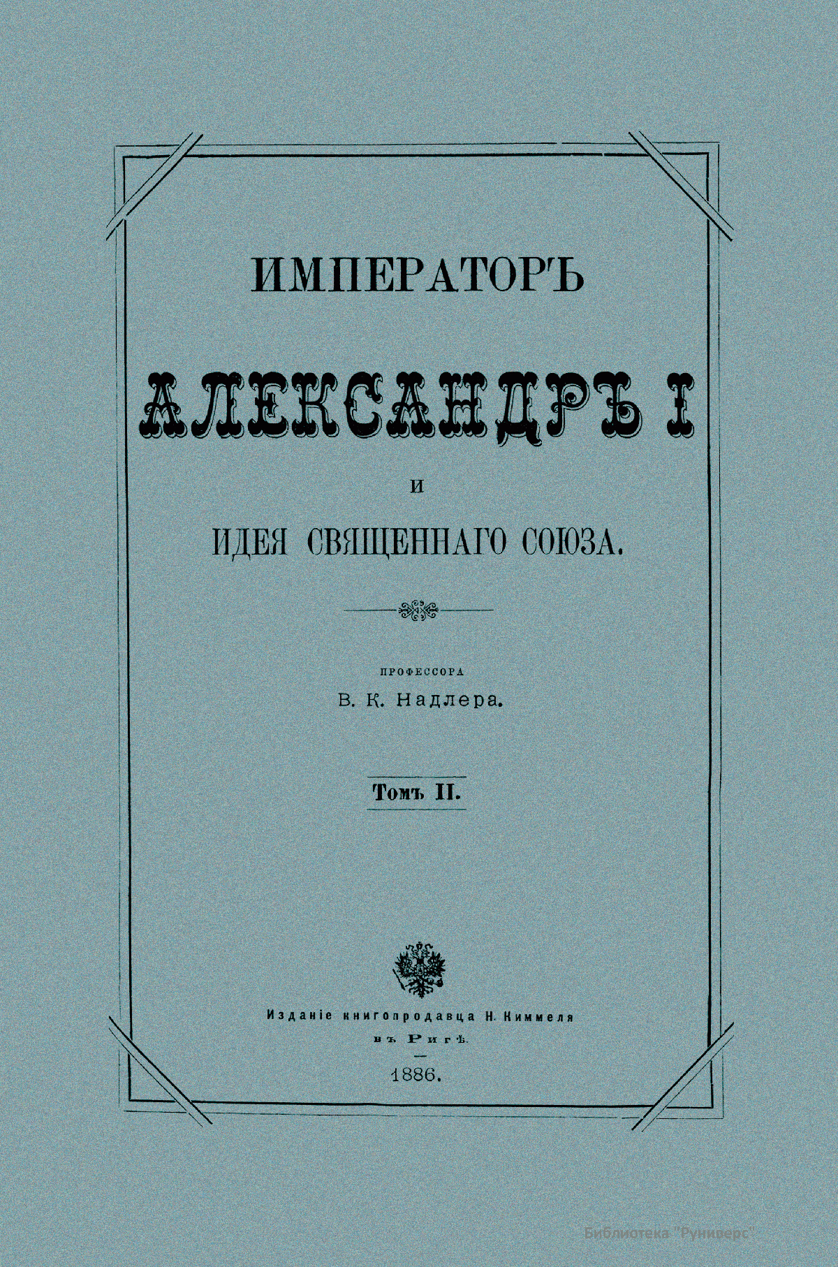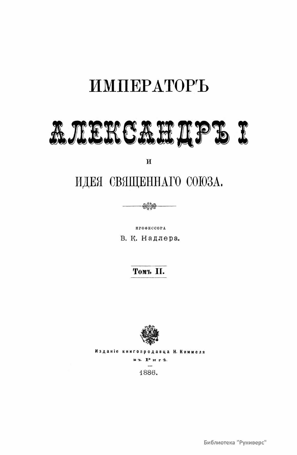 Пятитомное фундаментальное исследование профессора В. К. Надлера «Император Александр I и идея Священного союза» посвящено внешней политике России в 1812–1815 гг. с экскурсами в предшествовавшие и последующие времена и события. Издание было выпущено книгопродавцем Н. Киммелем в Риге в 1886–1892 гг., напечатано в харьковской типографии Окружного штаба. Автор сделал вывод, что идея Священного союза была единственной до начала ХIХ в. «серьезной и искренней попыткой организовать международные отношения на чистых началах христианской нравственности». Акт о Священном союзе содержал религиозно-мистическую фразеологию, возможно заимствованную из учения масонства. В статье I три договаривающихся монарха объявлялись соединенными «узами действительного и неразрывного братства», совсем как члены ма­сонской ложи высоких степеней. Они именовались «тремя ветвями од­ной семьи» и обязывались помогать друг другу в открытии «сокровищ любви, науки и беспредельной мудрости». Сочинение В. К. Надлера на историческом материале было призвано показать, что создание Священного союза опередило свое время, и не было понято современниками. Том I повествует о внутренней политике в России при Александре I. В нем рассматриваются вопросы внешней политики европейских держав, отношение к Наполеону и Отечественная война 1812 г. Том II рассказывает о завершении Отечественной войны — изгнании французов с земель России, а также переговоры и дипломатические отношения России с союзниками, подготовка к дальнейшей войне против Франции. Том III подводит итог прошедшей войне, здесь рассматриваются стратегические планы на 1813 г., переговорный процесс с союзниками и начало весенней кампании 1813 г. Анализируется ход сражений 1813 г. Том IV повествует о событиях 1814 г.: поражение Наполеона, оккупация Франции, восстановление монархии Бурбонов, переговоры и дипломатическая борьба союзников. Том V рассказывает о событиях 1815 г.: созыв Венского конгресса и его решения о создании Священного Союза, «100 дней» Наполеона и борьба с ним, вторичное восстановление монархии Бурбонов. Василий Карлович Надлер (1844–1894) — историк, профессор Харьковского, Новороссийского университета. Главные труды: «Причины и первые проявления оппозиции католицизму в Чехии и Западной Европе в конце XIV и начала XV века» (Харьков, 1864; магистерская диссертация); «Адальберт Бременский, правитель Германии в молодые годы Генриха IV» (Харьков, 1967; докторская диссертация); «Мифический элемент в истории» (Харьков, 1887) и др.