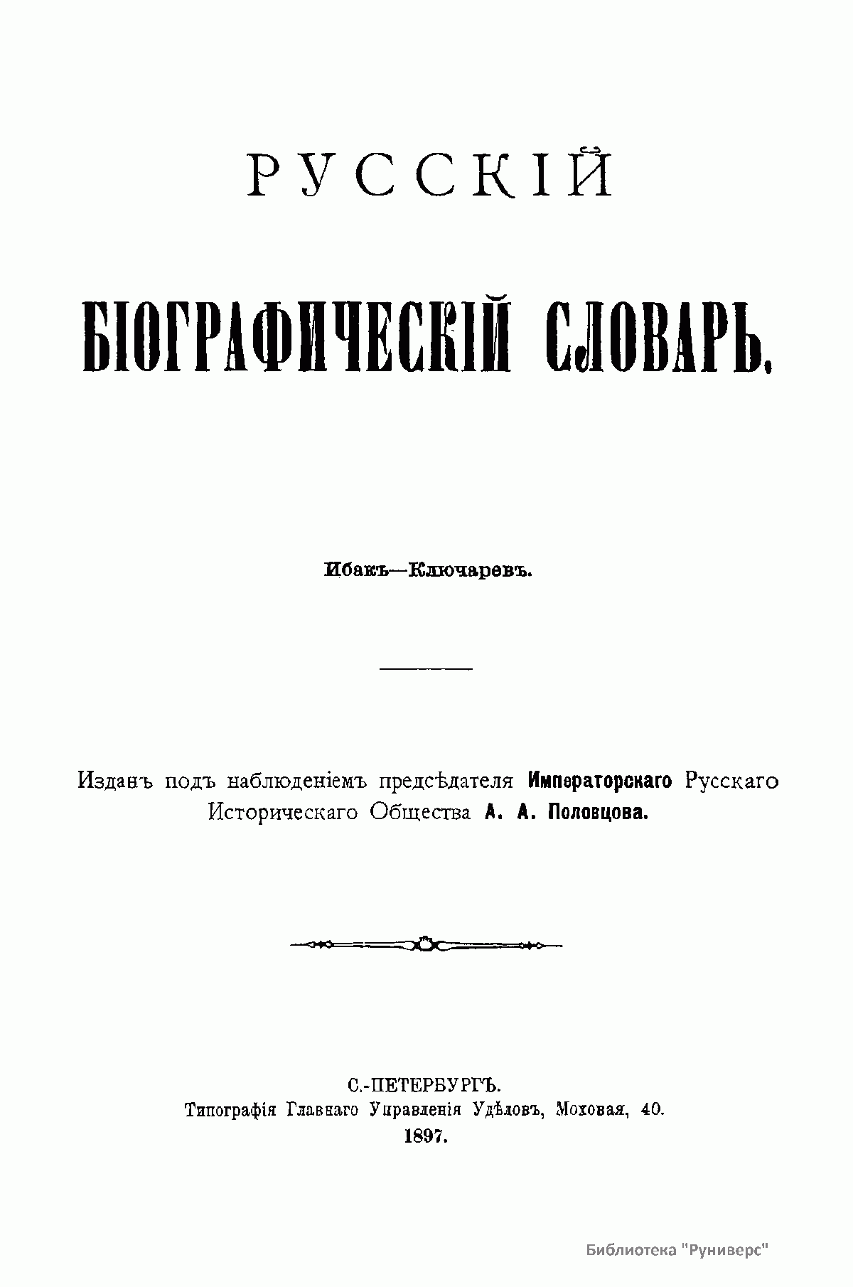 Русский биографический словарь (25 томов), в состав которого вошли имена и биографии виднейших деятелей государства, науки, просвещения и церковных деятелей, издавался Русским историческим обществом с 1896 по 1918 год. Русское историческое общество было основано в Санкт-Петербурге в 1866 году по инициативе известных отечественных историков, военных и государственных деятелей и ставило своей целью всесторонне содействовать развитию русского национального исторического просвещения. Общество пользовалось покровительством и финансовой поддержкой императорской семьи. Его деятельность носила археографический характер. Члены общества собирали исторические документы, которые публиковались в «Сборниках русского исторического общества». Всего до 1920 года (в этом году общество было закрыто) вышло 148 томов. Таким образом в научный оборот было введено большое количество документов XVIII – начала XIX века, ранее недоступных для исследователей, так как документальные материалы архивов царской России были для историков закрыты. К изданию русского биографического словаря, материалы которого до сих пор являются интереснейшим источником для исследователей, Общество приступило по инициативе императора Александра III. Тома биографического словаря выходили не в алфавитном порядке. С 1896 по 1909 год редактором словаря был руководитель Русского исторического общества, промышленник, член Сената Александр Александрович Половцев. Он выпустил 1, 2, 3, 6, 8, 12, 13, 14, 15, 18, 19, 21 и 22-й тома, поэтому этот словарь известен еще как «словарь Половцева».
