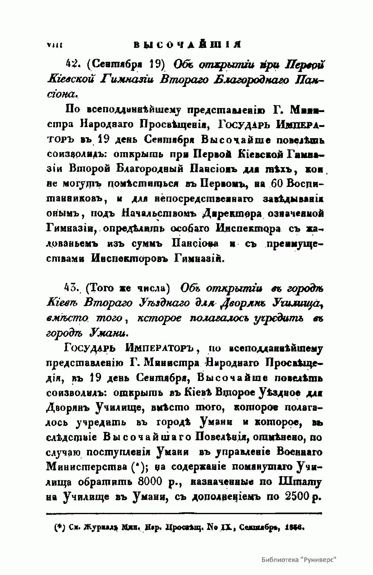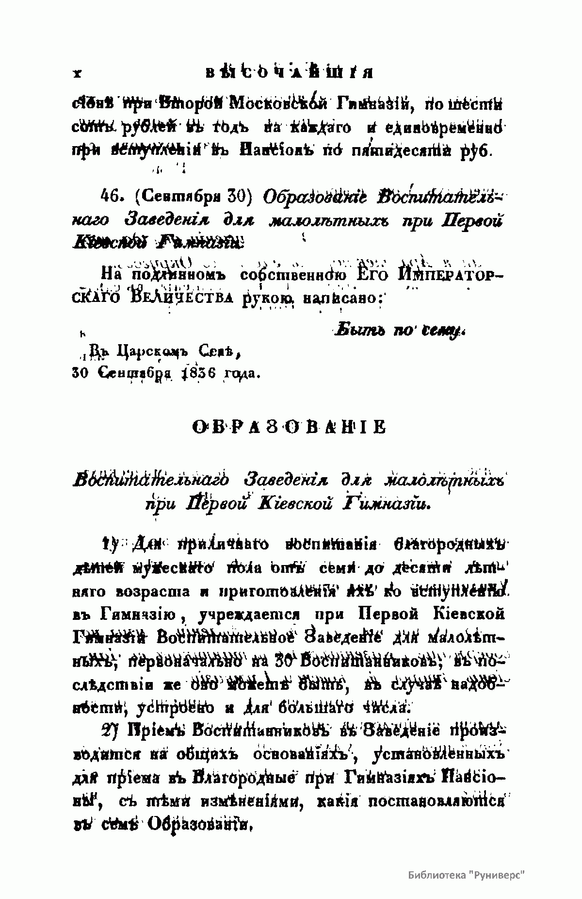 Журнал Министерства народного просвещения выходил с 1834-го по 1917 год. Официальный периодический журнал об успехах просвещения в России. Издатели журнала уверены в том, что «если для каждого человека необходим выход из грубой тьмы невежества и беспрерывное дальнейшее движение к свету, то для народов необходимо попечительное участие правительства в образовании. Только правительство имеет все средства знать и высоту успехов всемирного образования, и настоящие нужды Отечества».