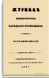 Журнал Министерства народного просвещения выходил с 1834-го по 1917 год. Официальный периодический журнал об успехах просвещения в России. Издатели журнала уверены в том, что «если для каждого человека необходим выход из грубой тьмы невежества и беспрерывное дальнейшее движение к свету, то для народов необходимо попечительное участие правительства в образовании. Только правительство имеет все средства знать и высоту успехов всемирного образования, и настоящие нужды Отечества».
