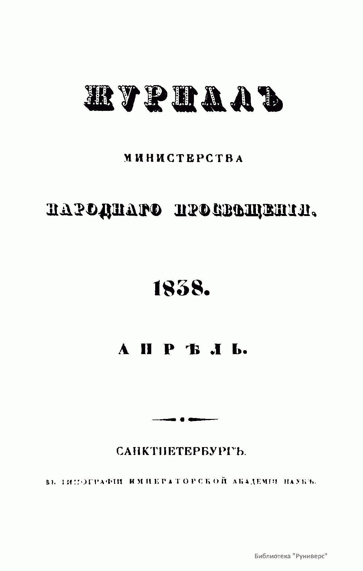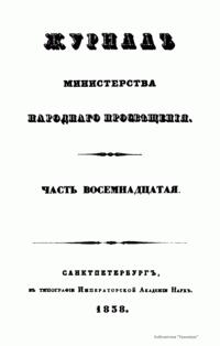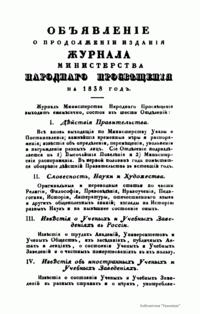 Журнал Министерства народного просвещения выходил с 1834-го по 1917 год. Официальный периодический журнал об успехах просвещения в России. Издатели журнала уверены в том, что «если для каждого человека необходим выход из грубой тьмы невежества и беспрерывное дальнейшее движение к свету, то для народов необходимо попечительное участие правительства в образовании. Только правительство имеет все средства знать и высоту успехов всемирного образования, и настоящие нужды Отечества».