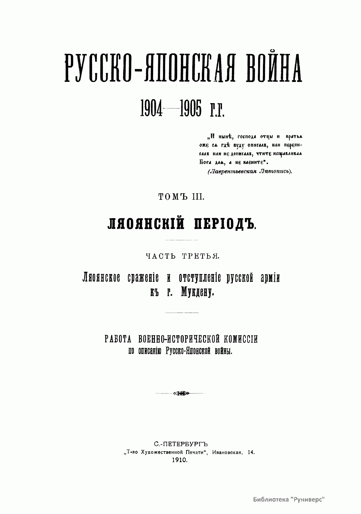 К началу 1910 г. работа была закончена, и в течение года была издана «Русско-японская война