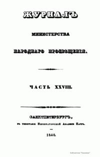 Журнал Министерства народного просвещения выходил с 1834-го по 1917 год. Официальный периодический журнал об успехах просвещения в России. Издатели журнала уверены в том, что «если для каждого человека необходим выход из грубой тьмы невежества и беспрерывное дальнейшее движение к свету, то для народов необходимо попечительное участие правительства в образовании. Только правительство имеет все средства знать и высоту успехов всемирного образования, и настоящие нужды Отечества».