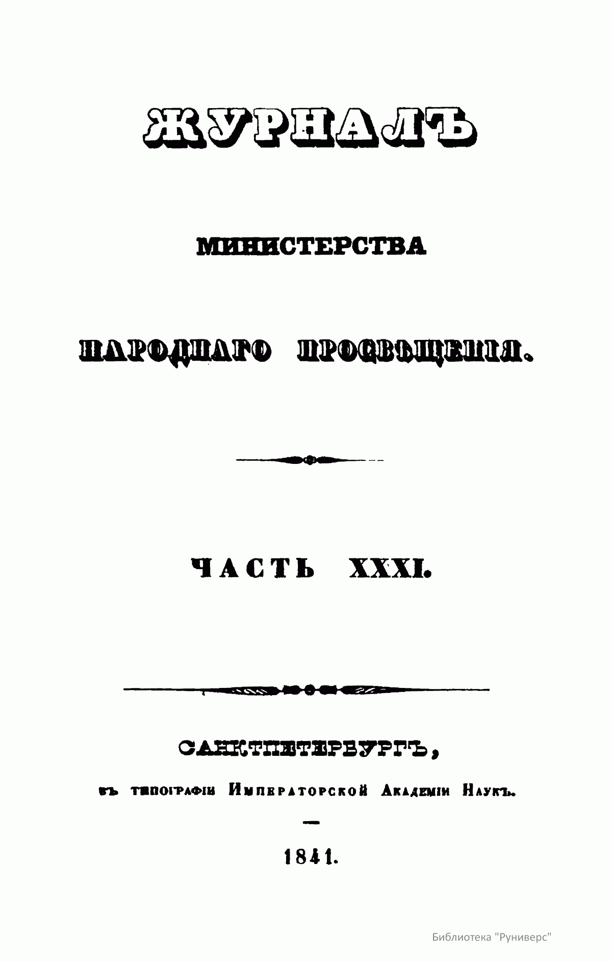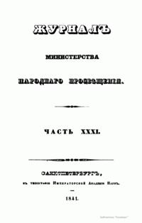 Журнал Министерства народного просвещения выходил с 1834-го по 1917 год. Официальный периодический журнал об успехах просвещения в России. Издатели журнала уверены в том, что «если для каждого человека необходим выход из грубой тьмы невежества и беспрерывное дальнейшее движение к свету, то для народов необходимо попечительное участие правительства в образовании. Только правительство имеет все средства знать и высоту успехов всемирного образования, и настоящие нужды Отечества».