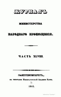 Журнал Министерства народного просвещения выходил с 1834-го по 1917 год. Официальный периодический журнал об успехах просвещения в России. Издатели журнала уверены в том, что «если для каждого человека необходим выход из грубой тьмы невежества и беспрерывное дальнейшее движение к свету, то для народов необходимо попечительное участие правительства в образовании. Только правительство имеет все средства знать и высоту успехов всемирного образования, и настоящие нужды Отечества».