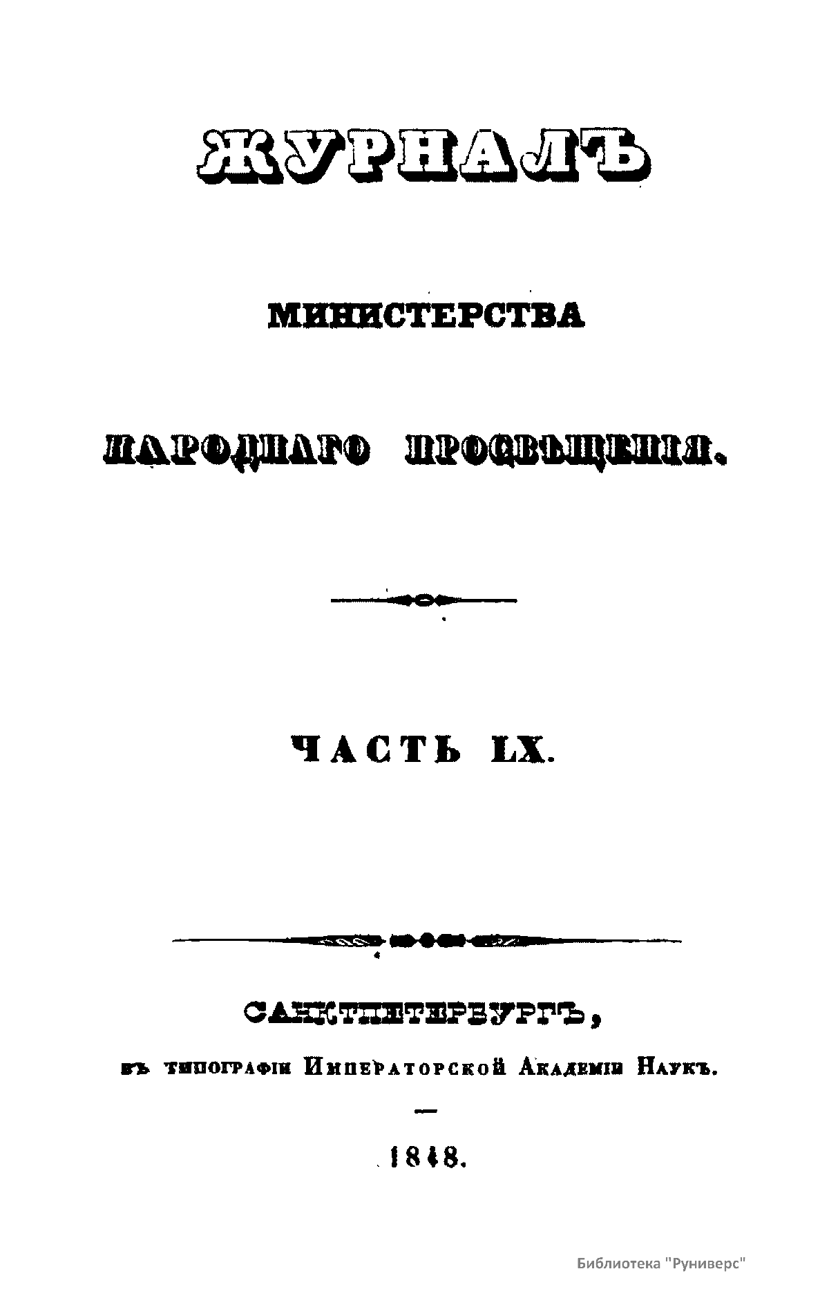 Журнал Министерства народного просвещения выходил с 1834-го по 1917 год. Официальный периодический журнал об успехах просвещения в России. Издатели журнала уверены в том, что «если для каждого человека необходим выход из грубой тьмы невежества и беспрерывное дальнейшее движение к свету, то для народов необходимо попечительное участие правительства в образовании. Только правительство имеет все средства знать и высоту успехов всемирного образования, и настоящие нужды Отечества».