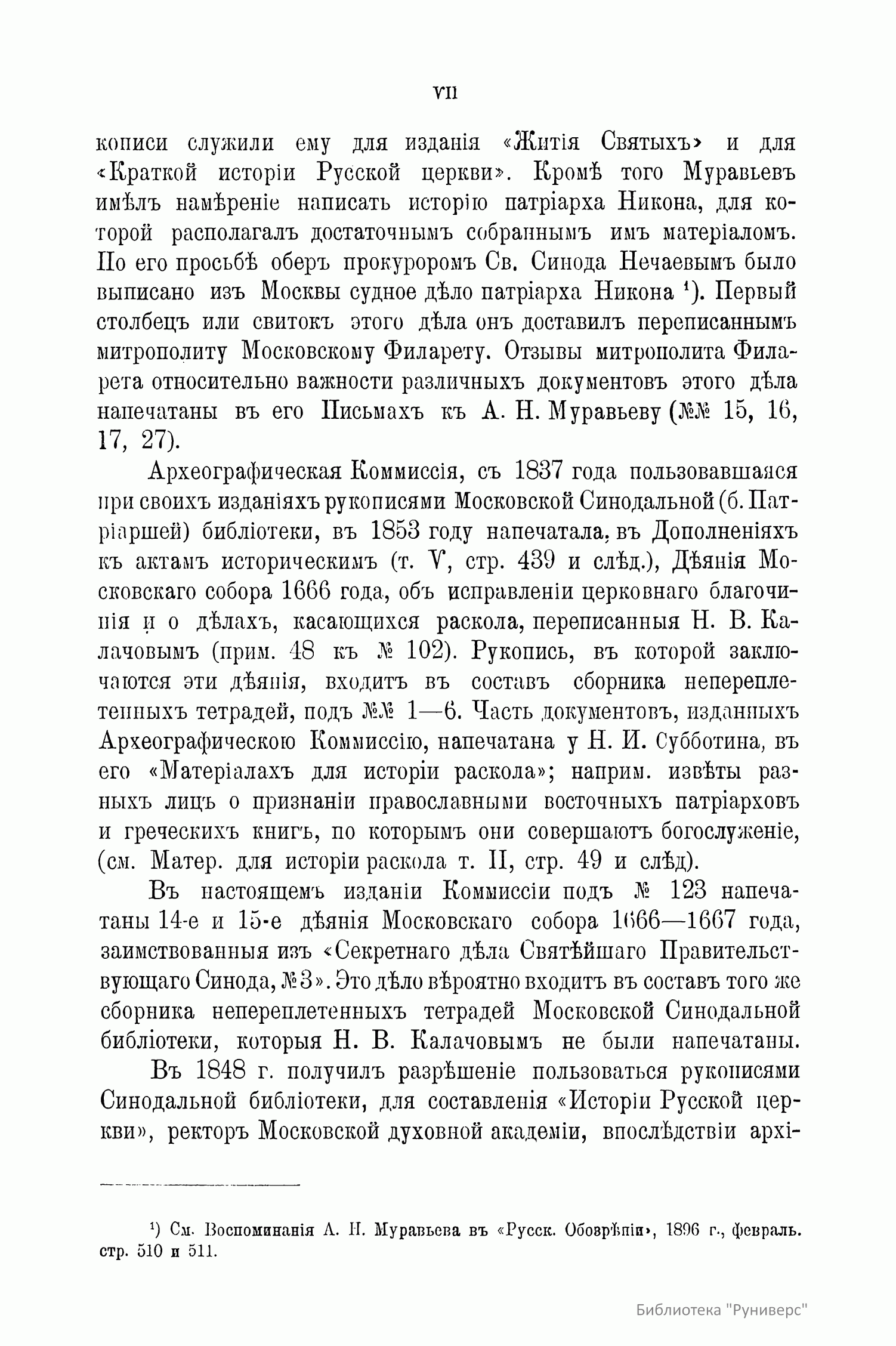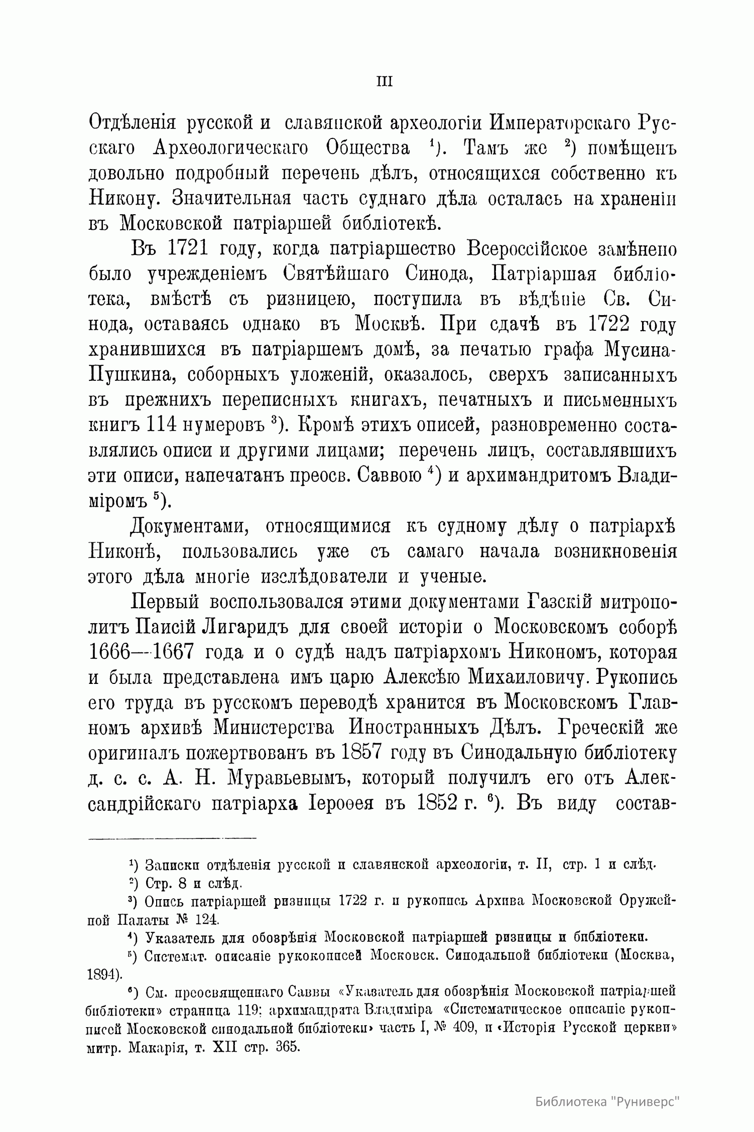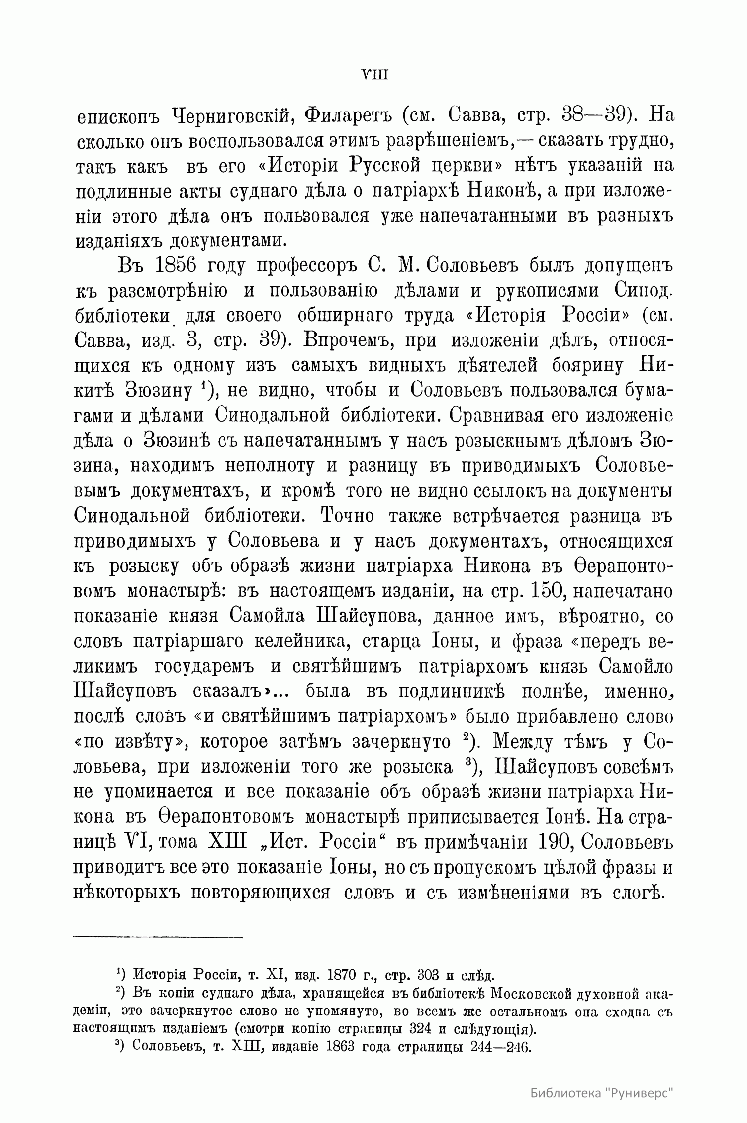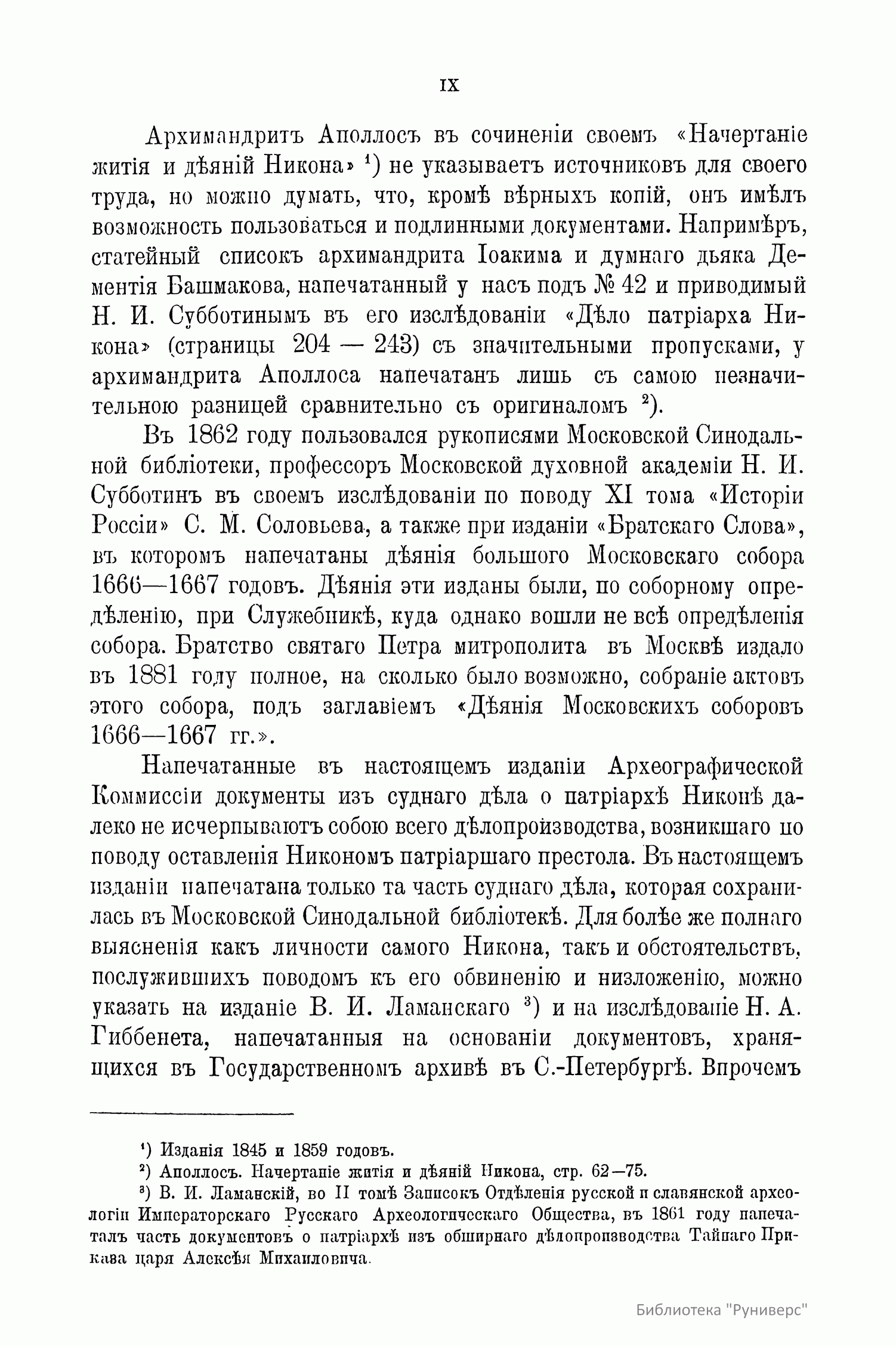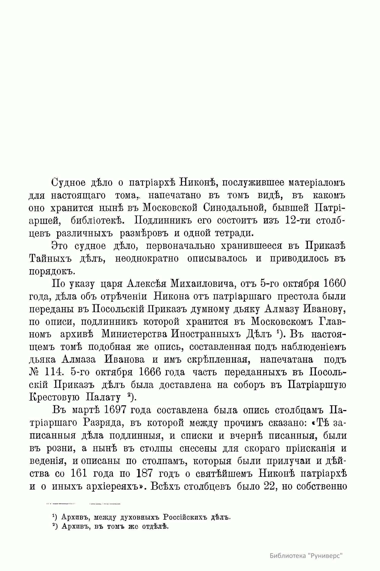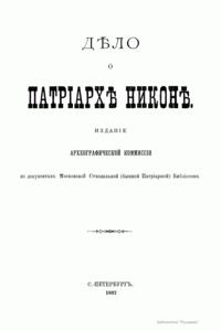 Никон (Никита Минов) (1605 – 1681), русский патриарх с 1652 г. Провел церковные реформы, вызвавшие раскол православной Руси. Как полагают историки, от четверти до трети населения сохранило верность древней традиции, верность старообрядчеству (старообрядцами стали называть тех, кто не принял реформ Никона и придерживался в религиозной и бытовой практике дореформенных правил и обычаев). Старообрядчество – самое мощное религиозное движение за всю русскую историю. Вмешательство Никона во внутреннюю и внешнюю политику государства с тезисом «священство выше царства» повлекло разрыв с царем. В 1658 г. Никон внезапно оставил патриарший престол, а собор 1666 – 1667 гг. осудил его и вождей старообрядчества, одновременно признав реформу. Никон был сослан. В настоящем издании опубликовано судное дело о патриархе Никоне. Подлинник его состоял из 12 столбцов различных размеров и одной тетради и хранился в Московской Синодальной библиотеке. Во вступительной статье подробно рассматривается история материалов о Никоне, а в оглавлении дается перечень всех 123 опубликованных документов.