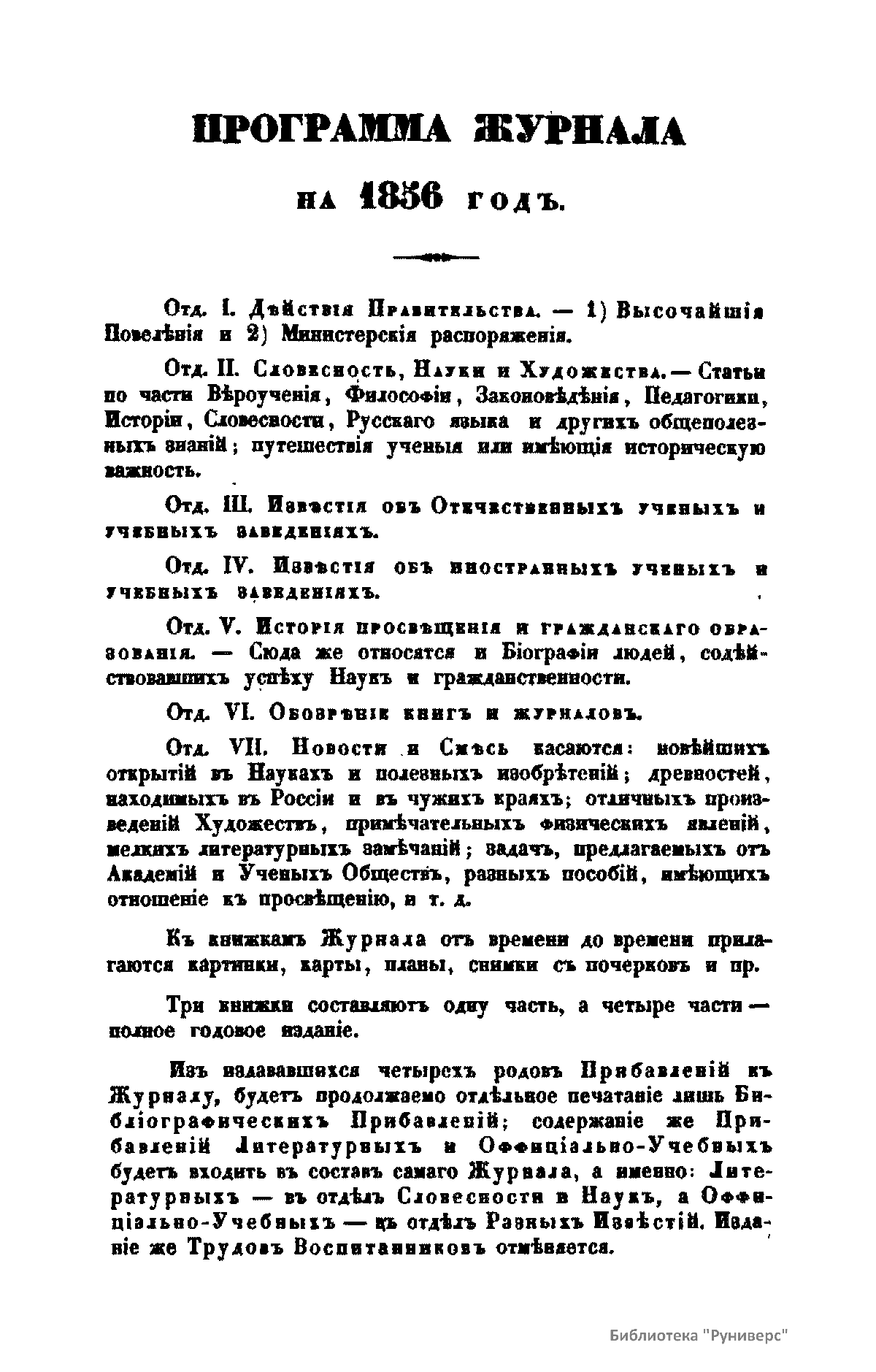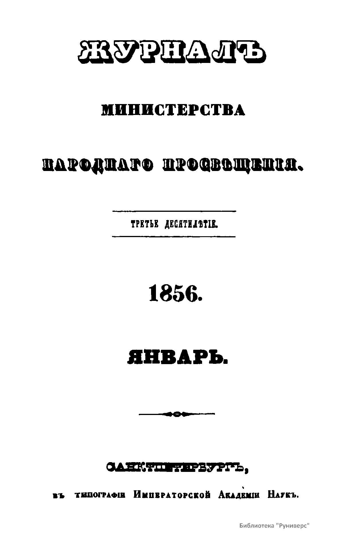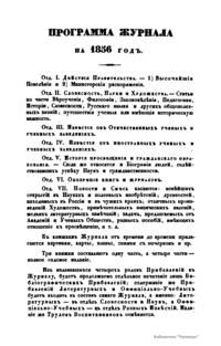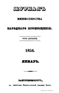 Журнал Министерства народного просвещения выходил с 1834-го по 1917 год. Официальный периодический журнал об успехах просвещения в России. Издатели журнала уверены в том, что «если для каждого человека необходим выход из грубой тьмы невежества и беспрерывное дальнейшее движение к свету, то для народов необходимо попечительное участие правительства в образовании. Только правительство имеет все средства знать и высоту успехов всемирного образования, и настоящие нужды Отечества».