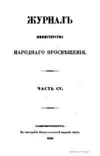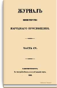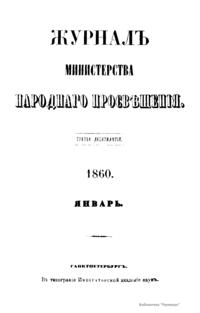 Журнал Министерства народного просвещения выходил с 1834-го по 1917 год. Официальный периодический журнал об успехах просвещения в России. Издатели журнала уверены в том, что «если для каждого человека необходим выход из грубой тьмы невежества и беспрерывное дальнейшее движение к свету, то для народов необходимо попечительное участие правительства в образовании. Только правительство имеет все средства знать и высоту успехов всемирного образования, и настоящие нужды Отечества».