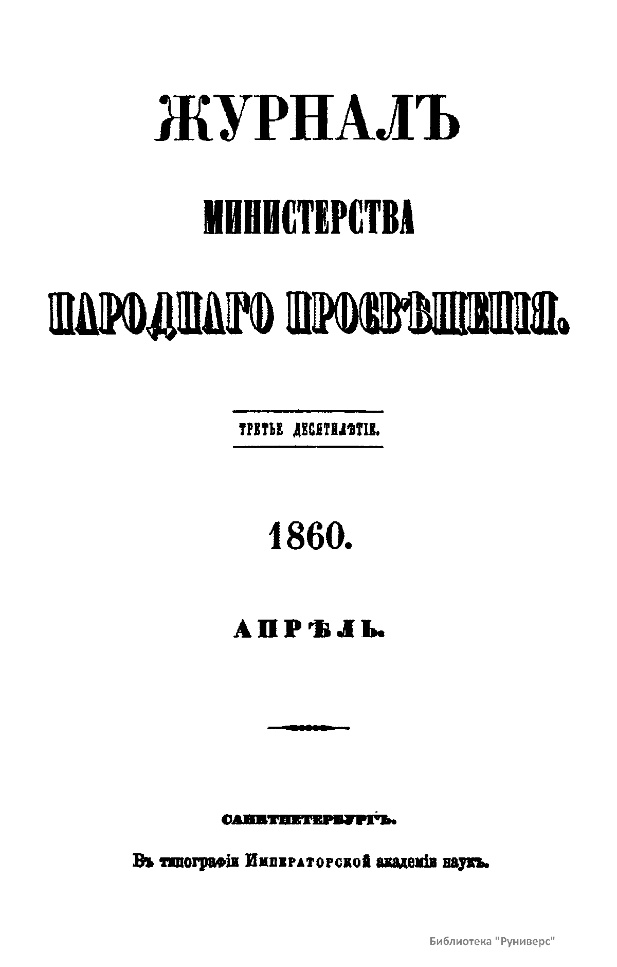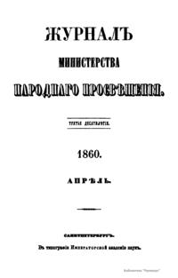 Журнал Министерства народного просвещения выходил с 1834-го по 1917 год. Официальный периодический журнал об успехах просвещения в России. Издатели журнала уверены в том, что «если для каждого человека необходим выход из грубой тьмы невежества и беспрерывное дальнейшее движение к свету, то для народов необходимо попечительное участие правительства в образовании. Только правительство имеет все средства знать и высоту успехов всемирного образования, и настоящие нужды Отечества».