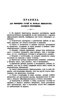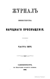 Журнал Министерства народного просвещения выходил с 1834-го по 1917 год. Официальный периодический журнал об успехах просвещения в России. Издатели журнала уверены в том, что «если для каждого человека необходим выход из грубой тьмы невежества и беспрерывное дальнейшее движение к свету, то для народов необходимо попечительное участие правительства в образовании. Только правительство имеет все средства знать и высоту успехов всемирного образования, и настоящие нужды Отечества».