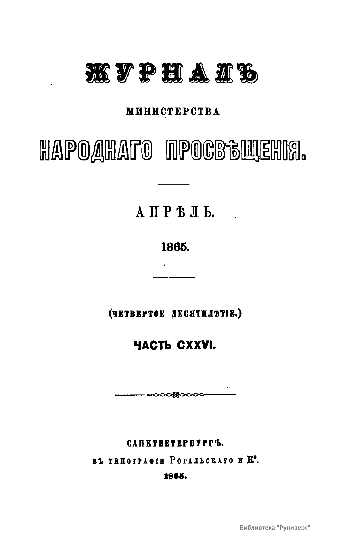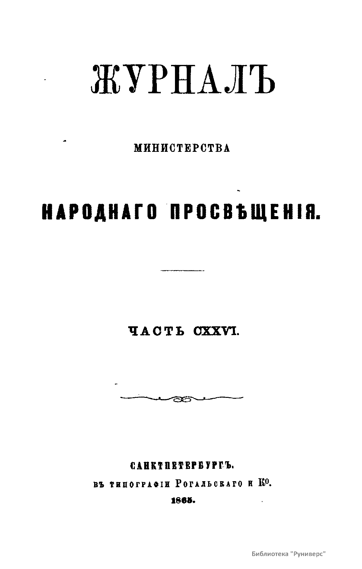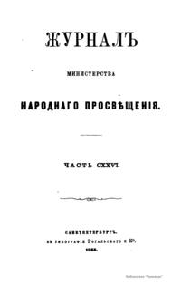 Журнал Министерства народного просвещения выходил с 1834-го по 1917 год. Официальный периодический журнал об успехах просвещения в России. Издатели журнала уверены в том, что «если для каждого человека необходим выход из грубой тьмы невежества и беспрерывное дальнейшее движение к свету, то для народов необходимо попечительное участие правительства в образовании. Только правительство имеет все средства знать и высоту успехов всемирного образования, и настоящие нужды Отечества».