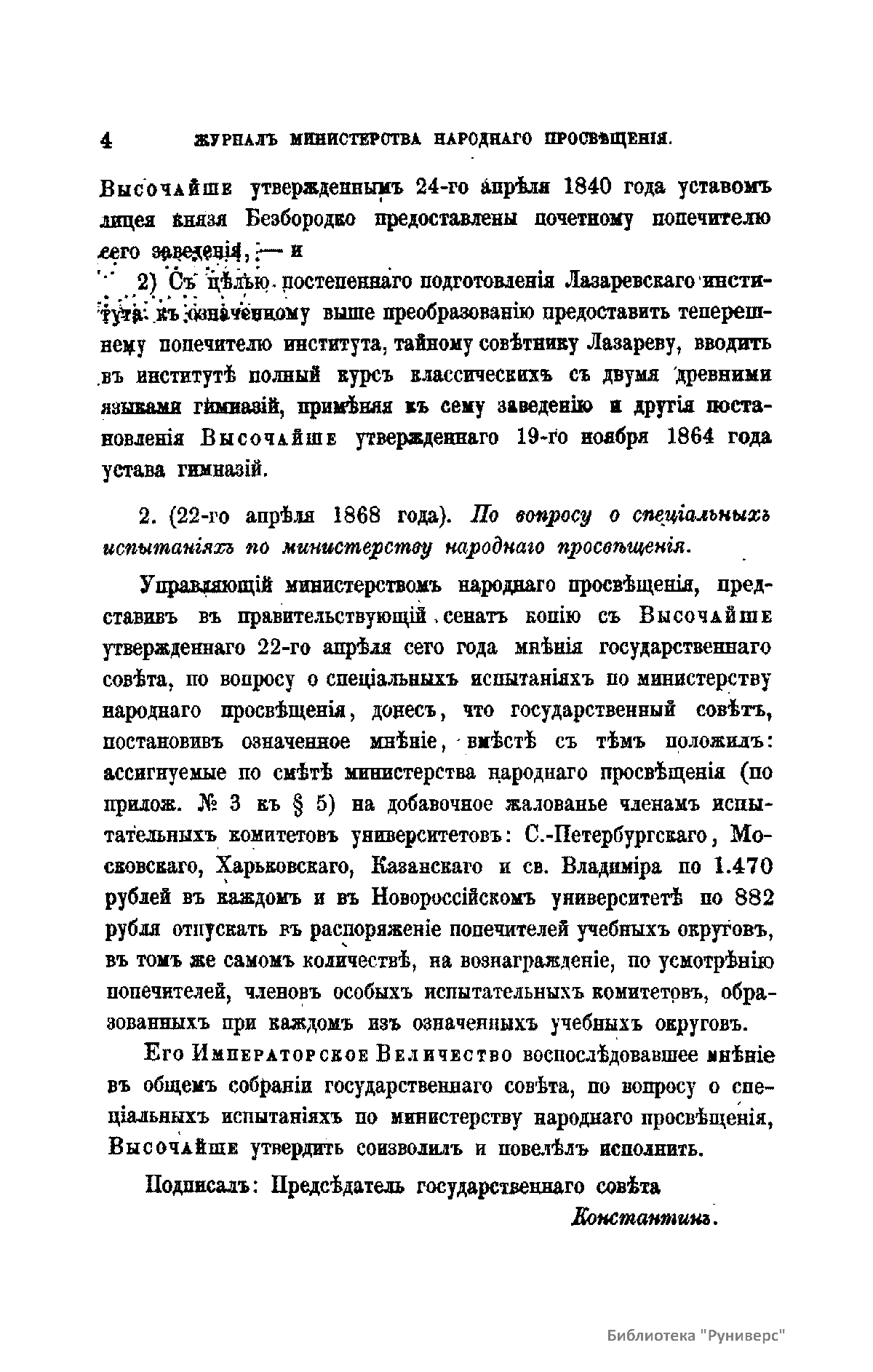 Журнал Министерства народного просвещения выходил с 1834-го по 1917 год. Официальный периодический журнал об успехах просвещения в России. Издатели журнала уверены в том, что «если для каждого человека необходим выход из грубой тьмы невежества и беспрерывное дальнейшее движение к свету, то для народов необходимо попечительное участие правительства в образовании. Только правительство имеет все средства знать и высоту успехов всемирного образования, и настоящие нужды Отечества».