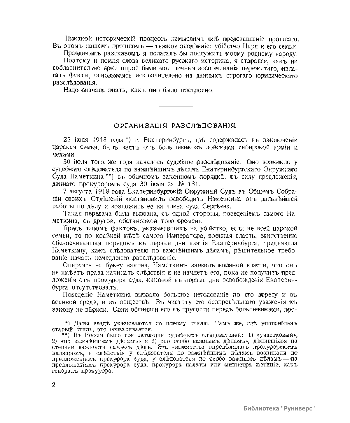 В настоящей книге, изданной в 1925 г. в Берлине, следователь по особо важным делам Омского окружного суда Николай Алексеевич Соколов опубликовал целый комплекс документов о гибели императора Николая II и его семьи. Следователь Соколов оказался первым, кто сумел с известной полнотой ответить на вопрос, который являлся десятки лет одной из самых охраняемых тайн советского государства. По его словам, он в пределах права «старался делать все возможное, чтобы найти истину и соблюсти ее для будущих поколений». Он понимал, что «личность потерпевшего и реальная действительность, в условиях которой совершилось преступление, придают ему особый характер – явления исторического». Свидетельства Соколова на долгие годы явились непререкаемым авторитетом в деле о гибели императора и его семьи. В начале 2000-х годов специалисты Генеральной прокуратуры довели до конца расследование екатеринбургской трагедии. Они собрали и проанализировали сотни документов, свидетельских показаний и, главное, нашли и идентифицировали останки императора, его семьи и приближенных. Следствие, начатое летом 1918 г., завершено почти через сто лет.