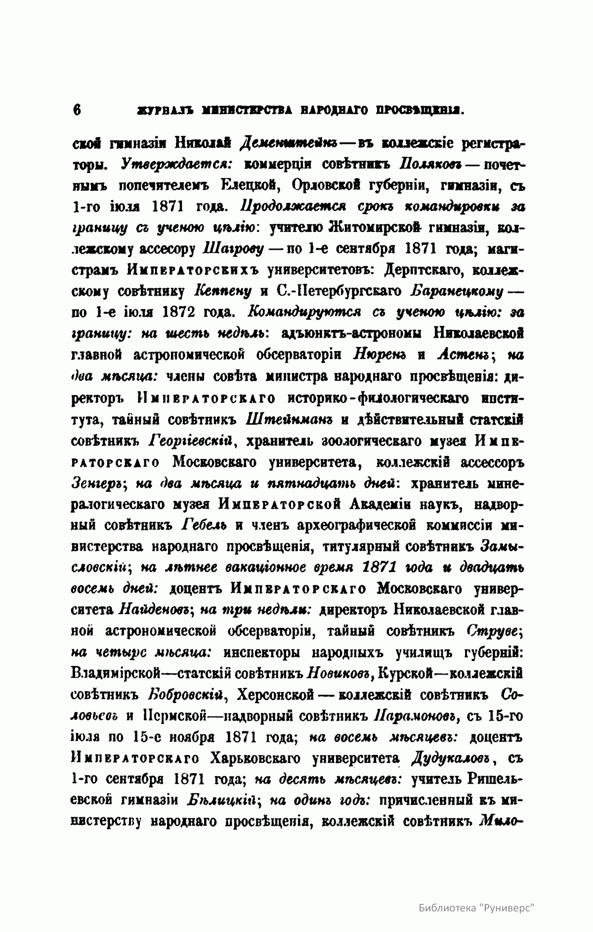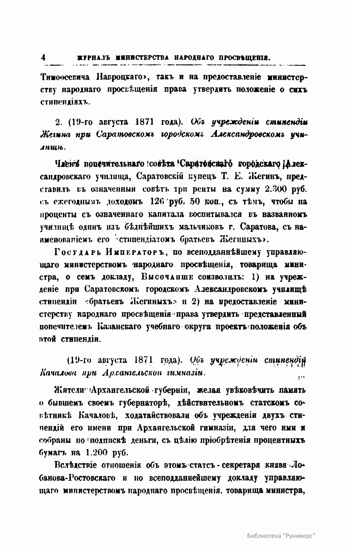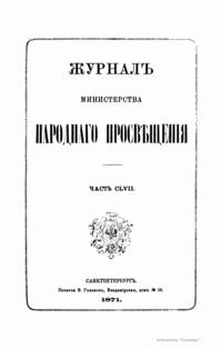 Журнал Министерства народного просвещения выходил с 1834-го по 1917 год. Официальный периодический журнал об успехах просвещения в России. Издатели журнала уверены в том, что «если для каждого человека необходим выход из грубой тьмы невежества и беспрерывное дальнейшее движение к свету, то для народов необходимо попечительное участие правительства в образовании. Только правительство имеет все средства знать и высоту успехов всемирного образования, и настоящие нужды Отечества».