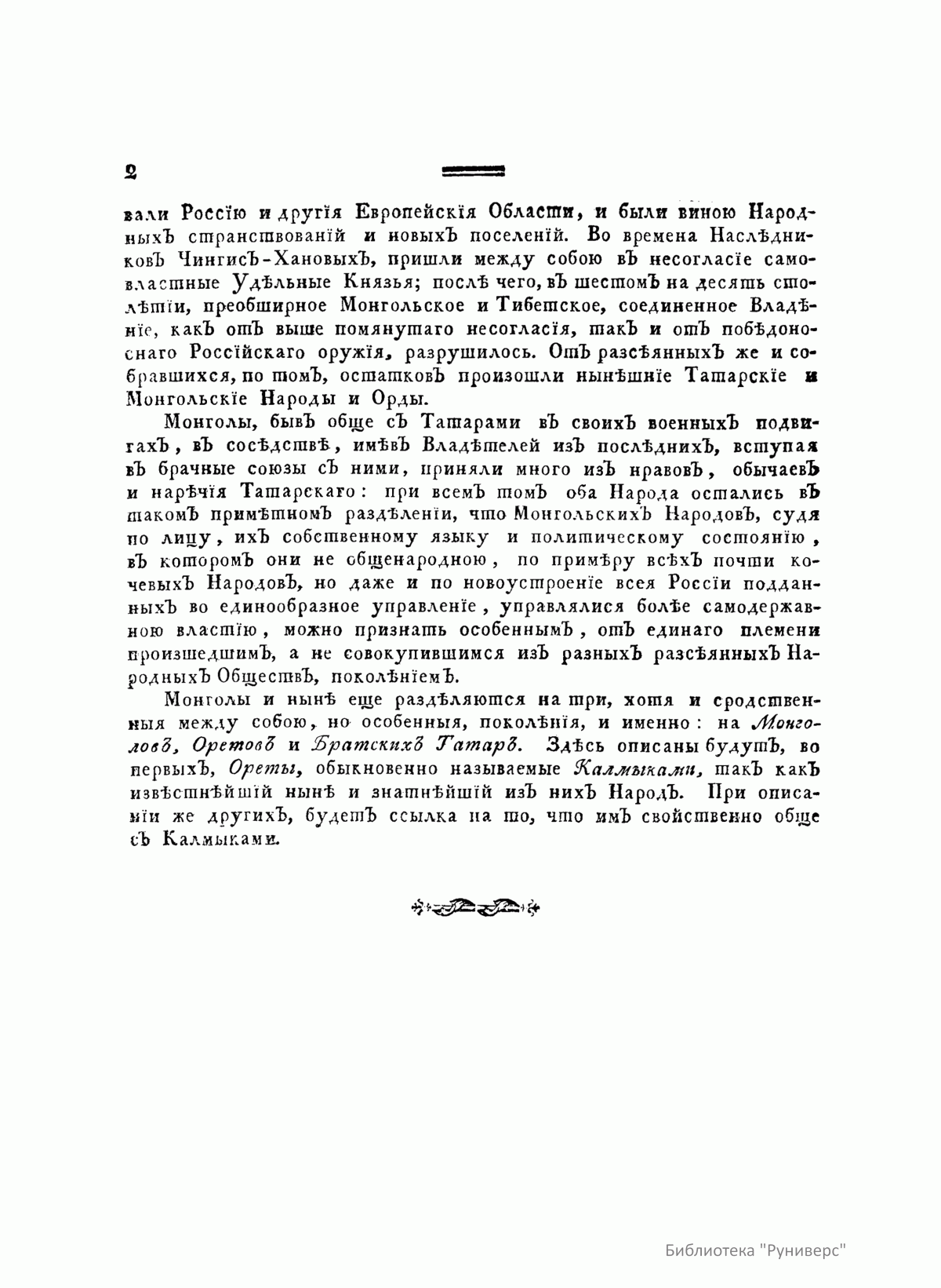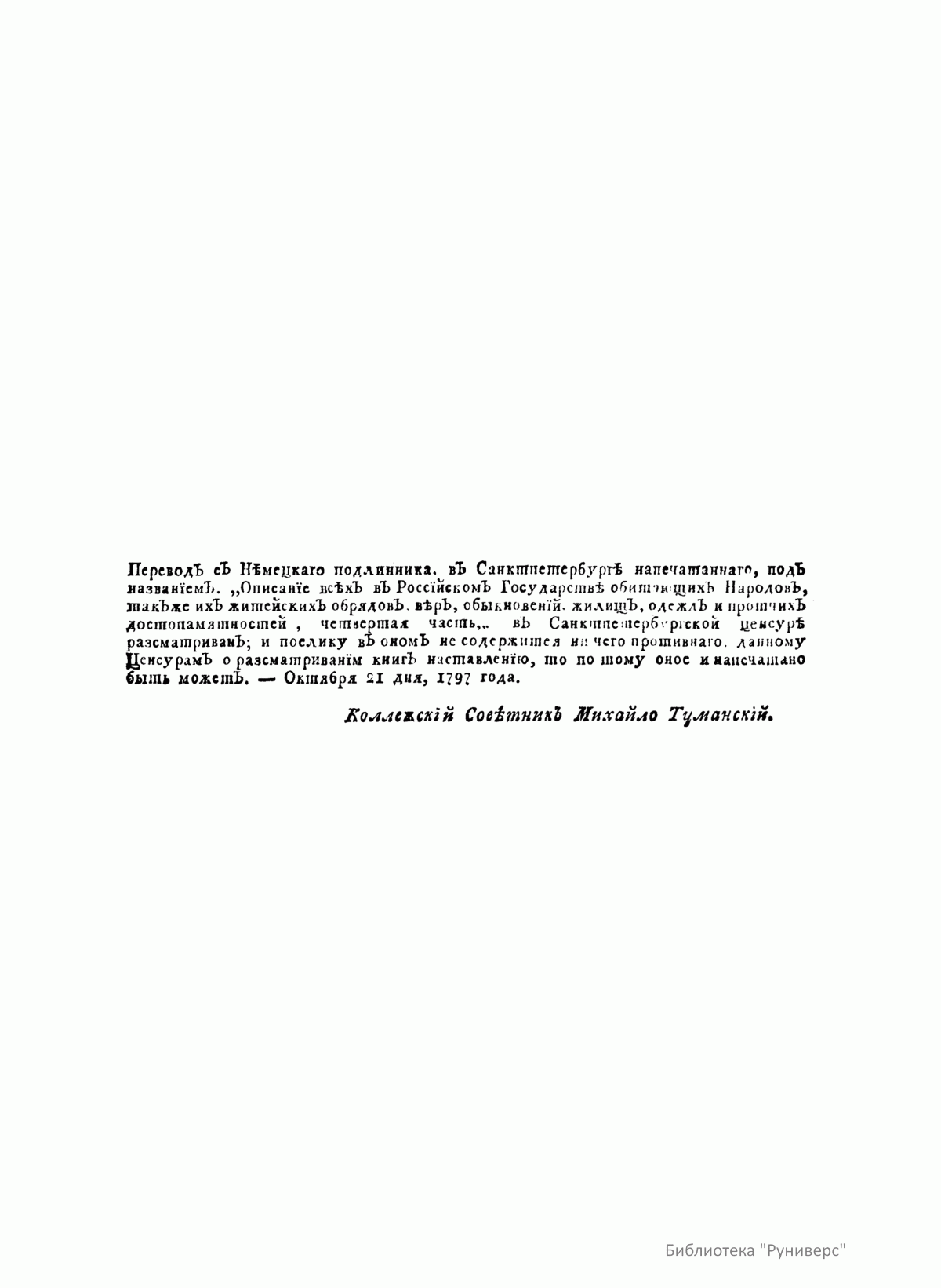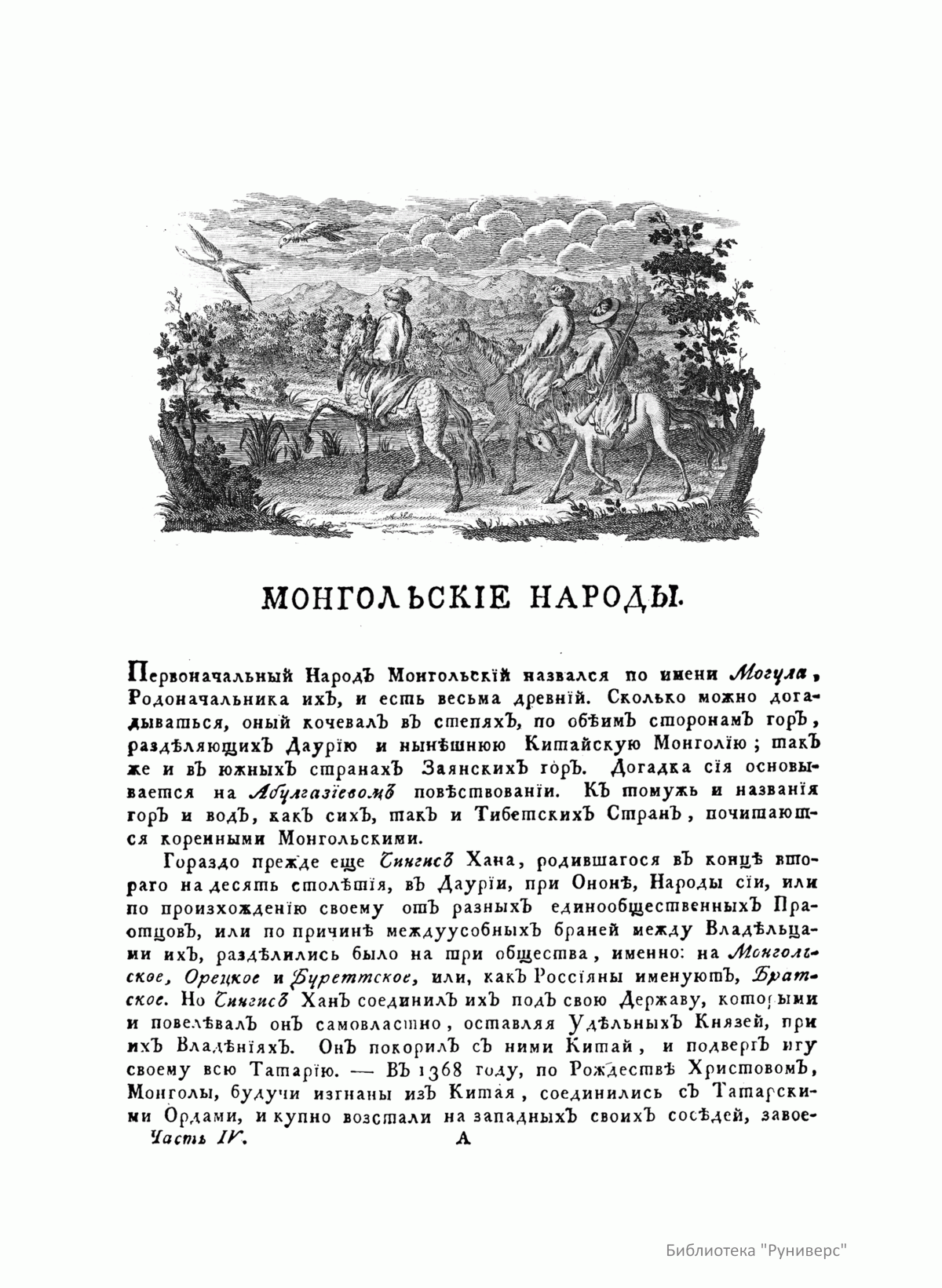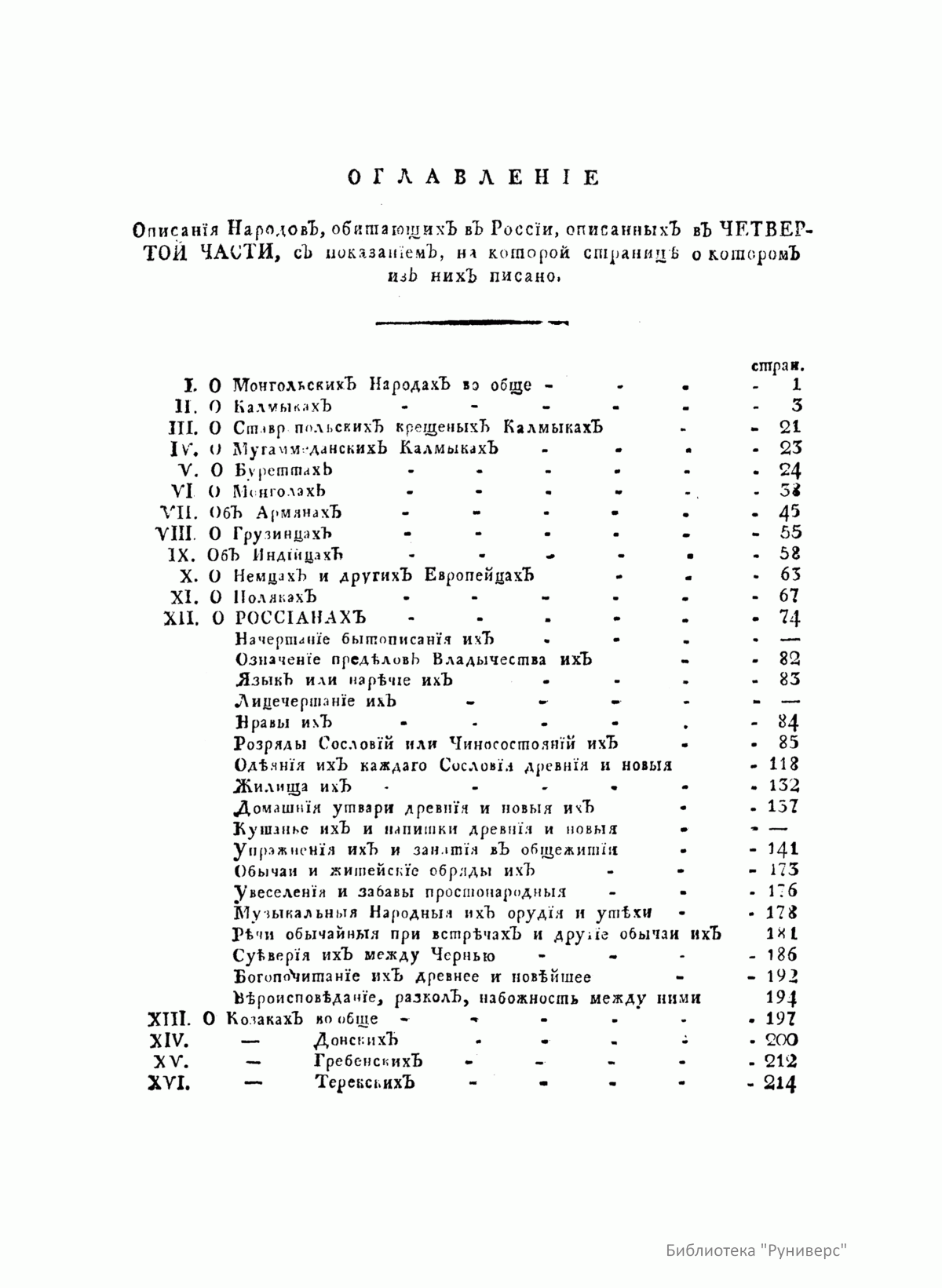 Описанiе всѣхъ обитающихъ въ Россiйскомъ государствѣ народовъ. Ихъ житейскихъ обрядовъ, обыкновенiй, одеждъ, жилищъ, упражненiй, забавъ, вѣроисповѣданiй и другихъ достопамятностей. Часть четвертая о народахъ монгольскихъ, объ армянахъ, грузинахъ, индiйцахъ, немцахъ, полякахъ и о владычествующихъ россiанахъ, съ описанiемъ всѣхъ именованiй козаковъ, такъ же Исторiя о Малой Россiи и купно о Курландiи и Литвѣ
