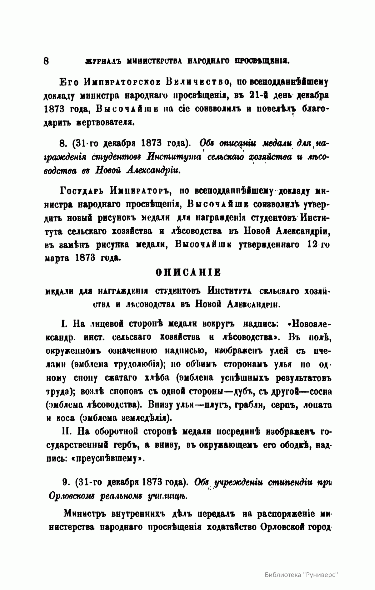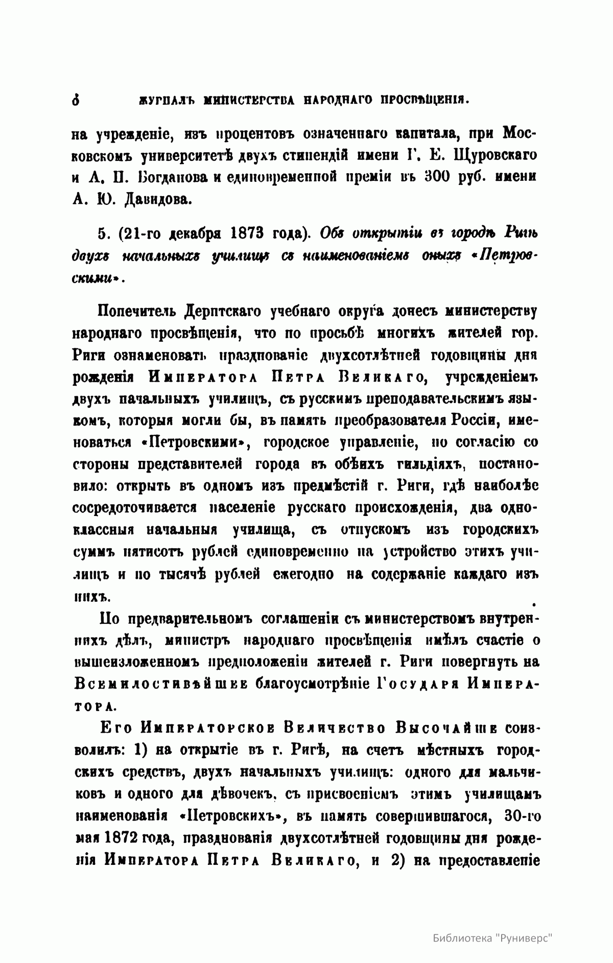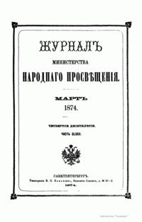 Журнал Министерства народного просвещения выходил с 1834-го по 1917 год. Официальный периодический журнал об успехах просвещения в России. Издатели журнала уверены в том, что «если для каждого человека необходим выход из грубой тьмы невежества и беспрерывное дальнейшее движение к свету, то для народов необходимо попечительное участие правительства в образовании. Только правительство имеет все средства знать и высоту успехов всемирного образования, и настоящие нужды Отечества».