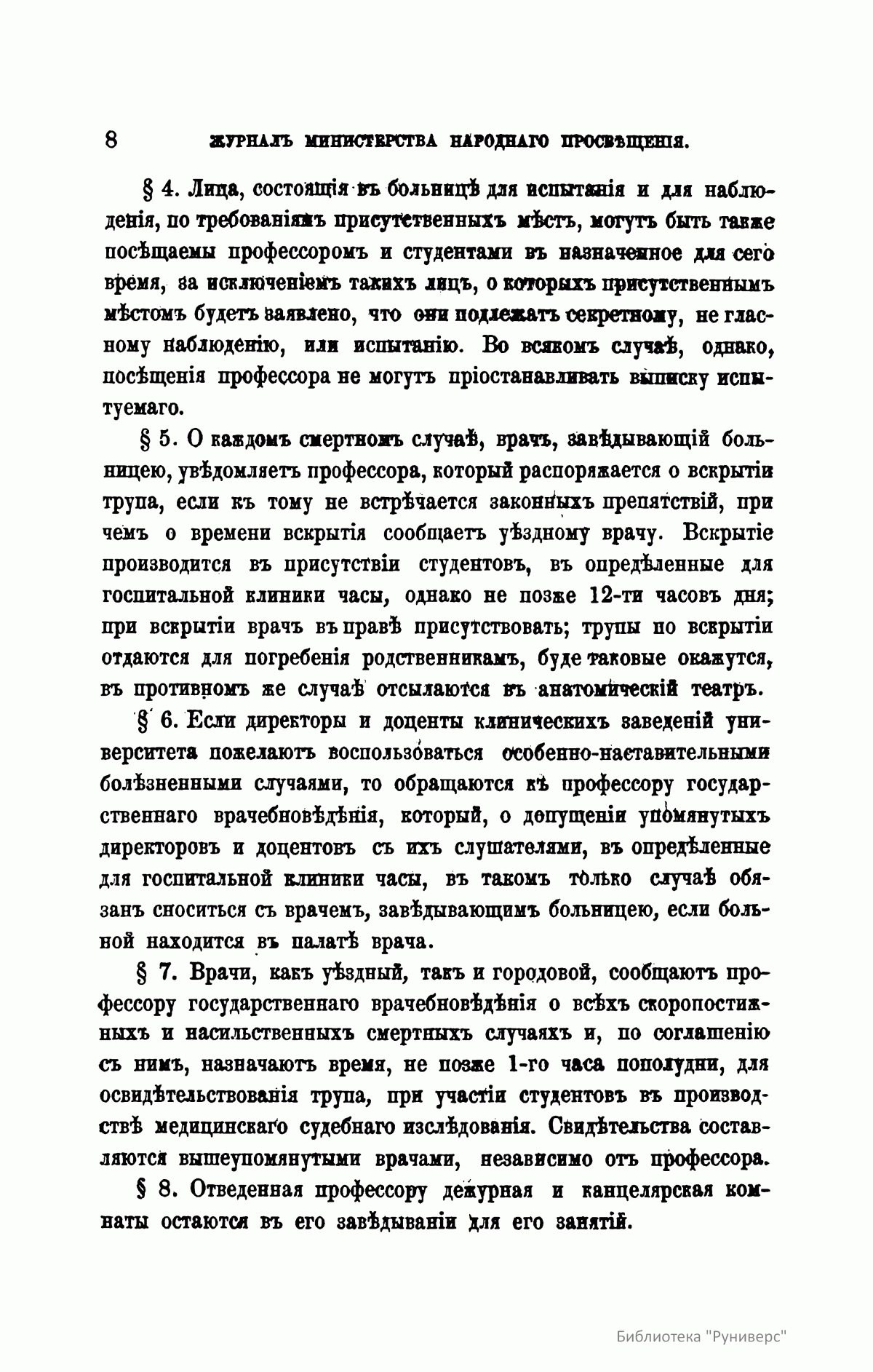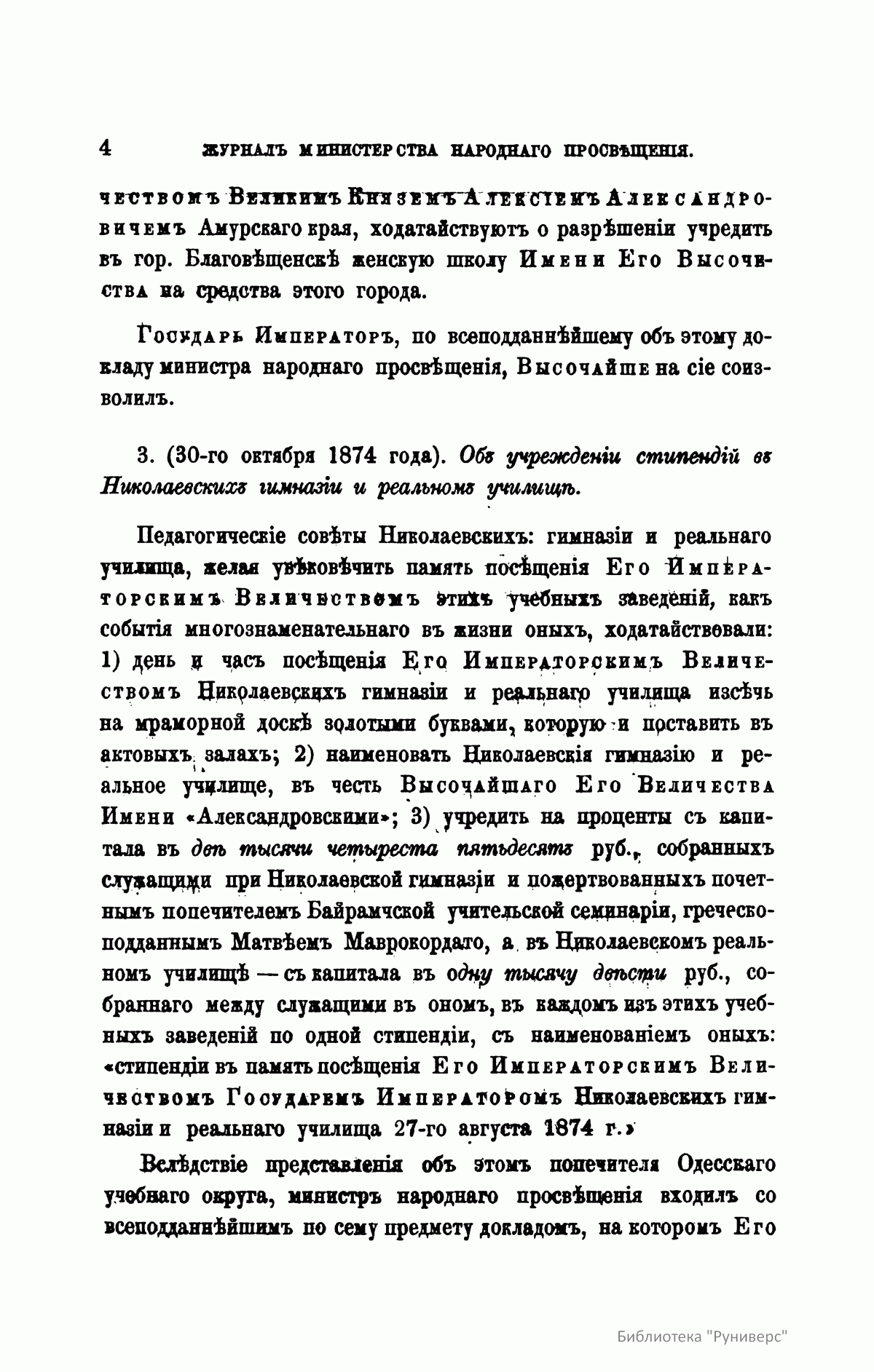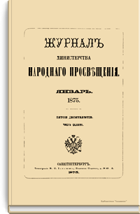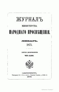 Журнал Министерства народного просвещения выходил с 1834-го по 1917 год. Официальный периодический журнал об успехах просвещения в России. Издатели журнала уверены в том, что «если для каждого человека необходим выход из грубой тьмы невежества и беспрерывное дальнейшее движение к свету, то для народов необходимо попечительное участие правительства в образовании. Только правительство имеет все средства знать и высоту успехов всемирного образования, и настоящие нужды Отечества».