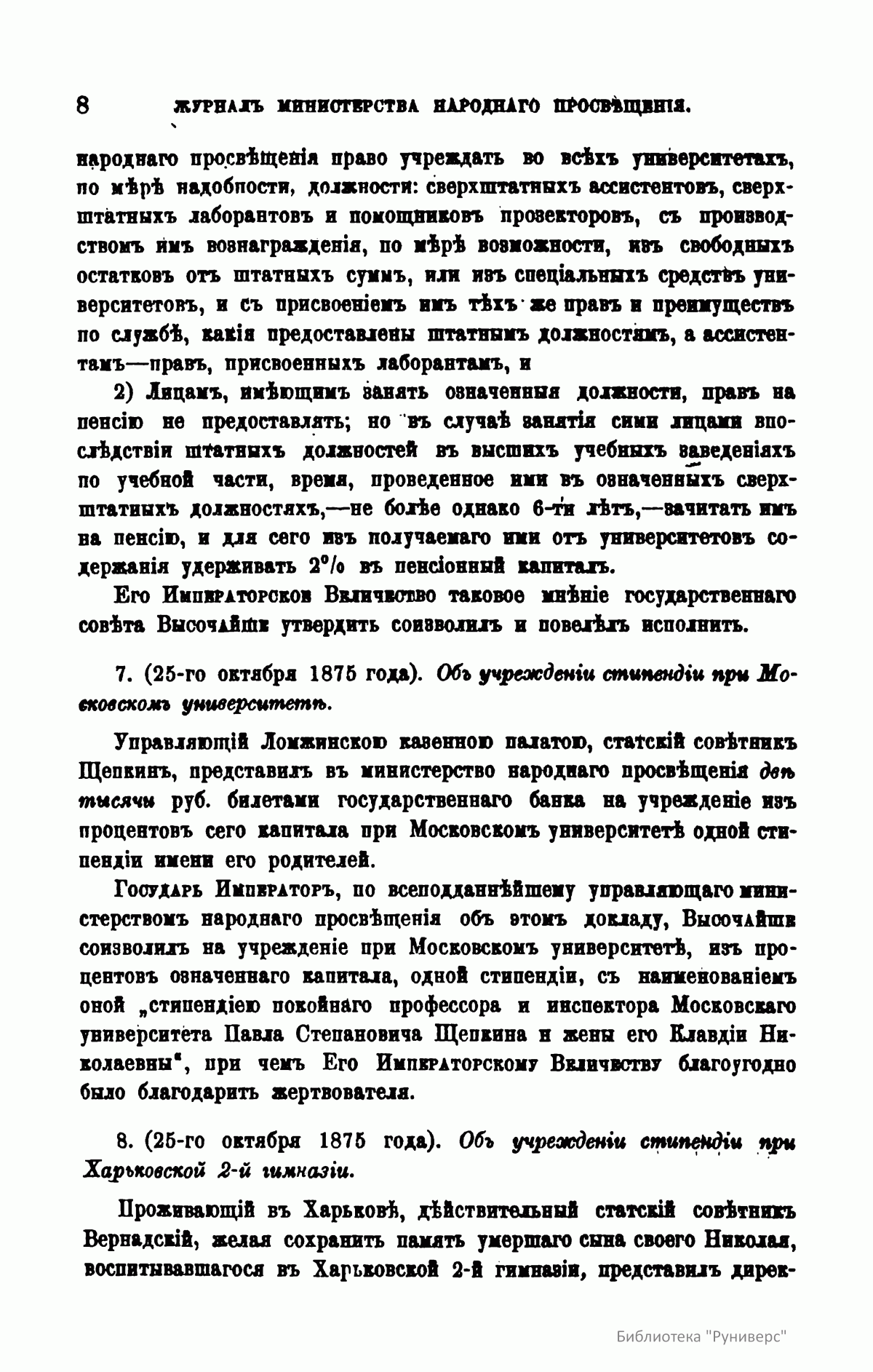 Журнал Министерства народного просвещения выходил с 1834-го по 1917 год. Официальный периодический журнал об успехах просвещения в России. Издатели журнала уверены в том, что «если для каждого человека необходим выход из грубой тьмы невежества и беспрерывное дальнейшее движение к свету, то для народов необходимо попечительное участие правительства в образовании. Только правительство имеет все средства знать и высоту успехов всемирного образования, и настоящие нужды Отечества».