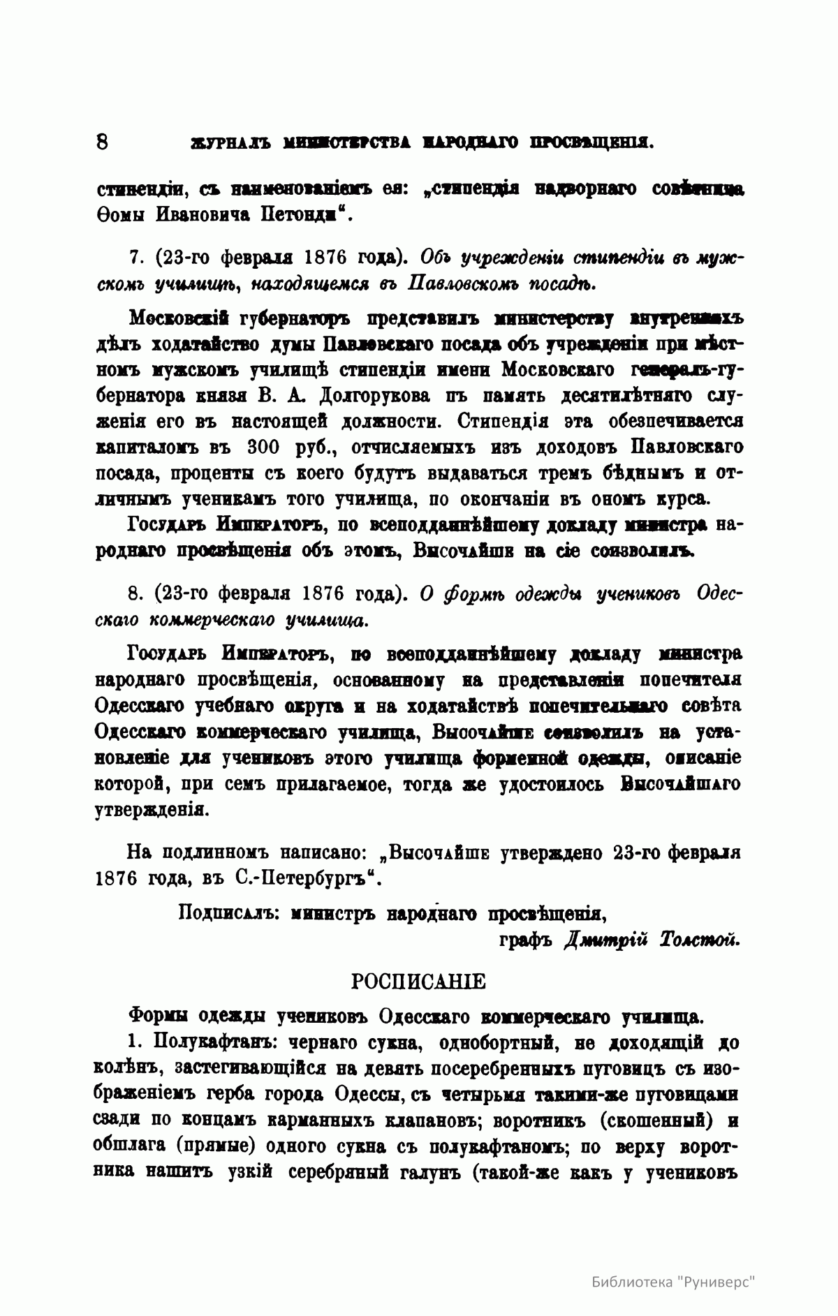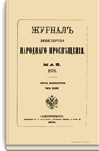 Журнал Министерства народного просвещения выходил с 1834-го по 1917 год. Официальный периодический журнал об успехах просвещения в России. Издатели журнала уверены в том, что «если для каждого человека необходим выход из грубой тьмы невежества и беспрерывное дальнейшее движение к свету, то для народов необходимо попечительное участие правительства в образовании. Только правительство имеет все средства знать и высоту успехов всемирного образования, и настоящие нужды Отечества».