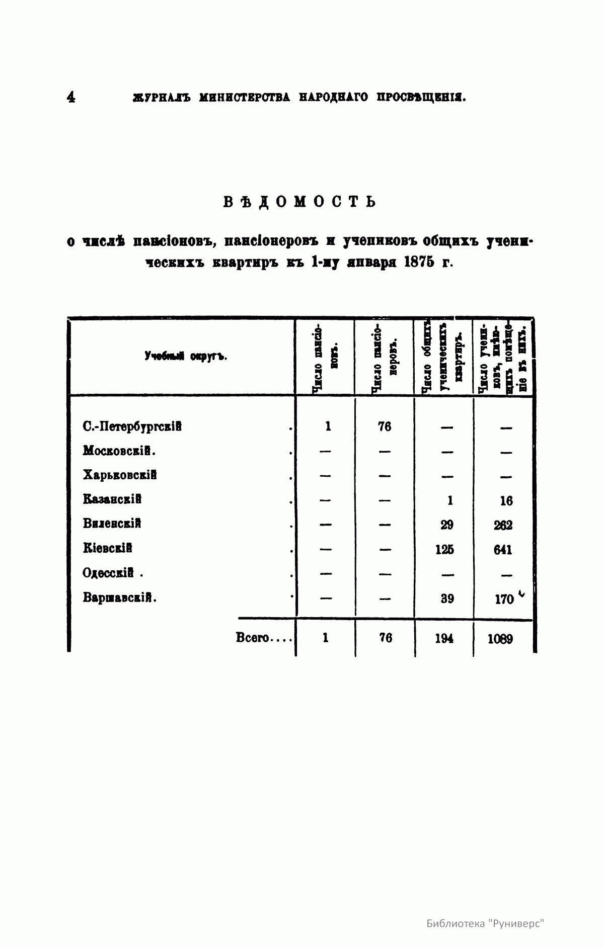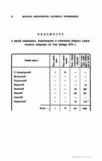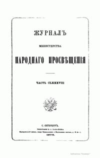Журнал Министерства народного просвещения выходил с 1834-го по 1917 год. Официальный периодический журнал об успехах просвещения в России. Издатели журнала уверены в том, что «если для каждого человека необходим выход из грубой тьмы невежества и беспрерывное дальнейшее движение к свету, то для народов необходимо попечительное участие правительства в образовании. Только правительство имеет все средства знать и высоту успехов всемирного образования, и настоящие нужды Отечества».