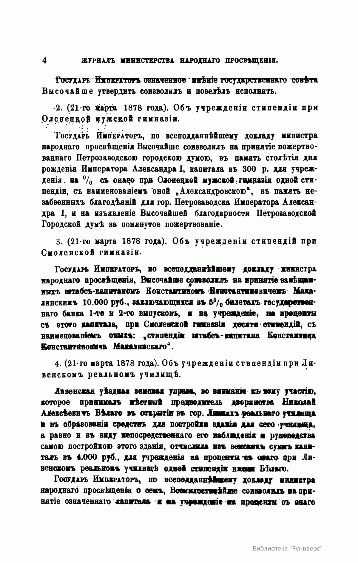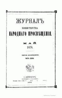 Журнал Министерства народного просвещения выходил с 1834-го по 1917 год. Официальный периодический журнал об успехах просвещения в России. Издатели журнала уверены в том, что «если для каждого человека необходим выход из грубой тьмы невежества и беспрерывное дальнейшее движение к свету, то для народов необходимо попечительное участие правительства в образовании. Только правительство имеет все средства знать и высоту успехов всемирного образования, и настоящие нужды Отечества».