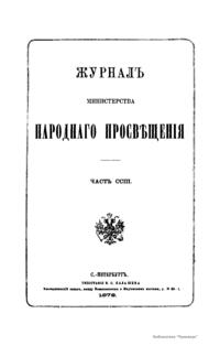 Журнал Министерства народного просвещения выходил с 1834-го по 1917 год. Официальный периодический журнал об успехах просвещения в России. Издатели журнала уверены в том, что «если для каждого человека необходим выход из грубой тьмы невежества и беспрерывное дальнейшее движение к свету, то для народов необходимо попечительное участие правительства в образовании. Только правительство имеет все средства знать и высоту успехов всемирного образования, и настоящие нужды Отечества».