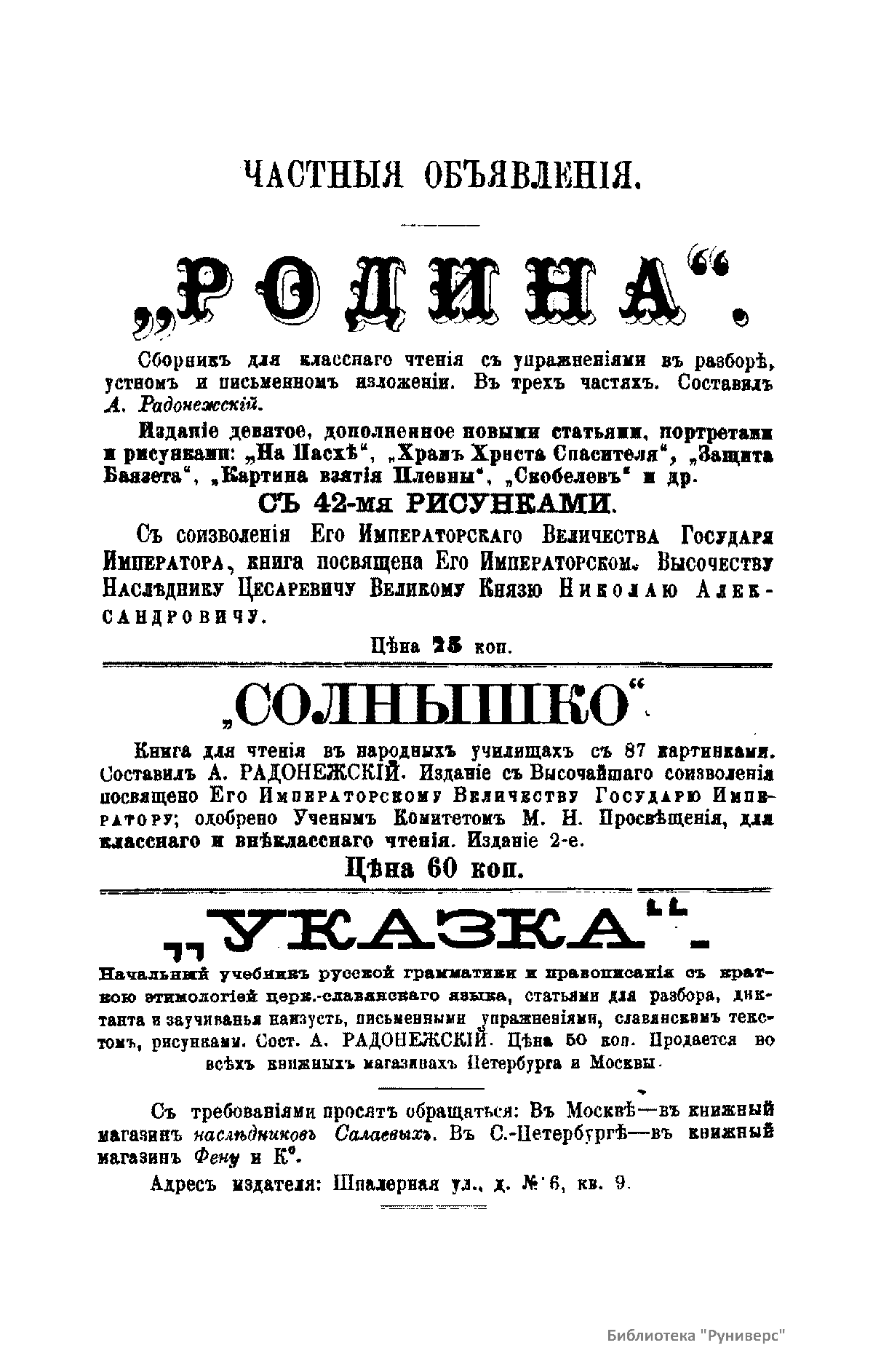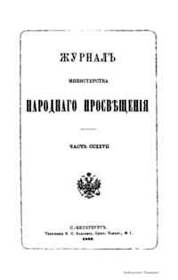 Журнал Министерства народного просвещения выходил с 1834-го по 1917 год. Официальный периодический журнал об успехах просвещения в России. Издатели журнала уверены в том, что «если для каждого человека необходим выход из грубой тьмы невежества и беспрерывное дальнейшее движение к свету, то для народов необходимо попечительное участие правительства в образовании. Только правительство имеет все средства знать и высоту успехов всемирного образования, и настоящие нужды Отечества».