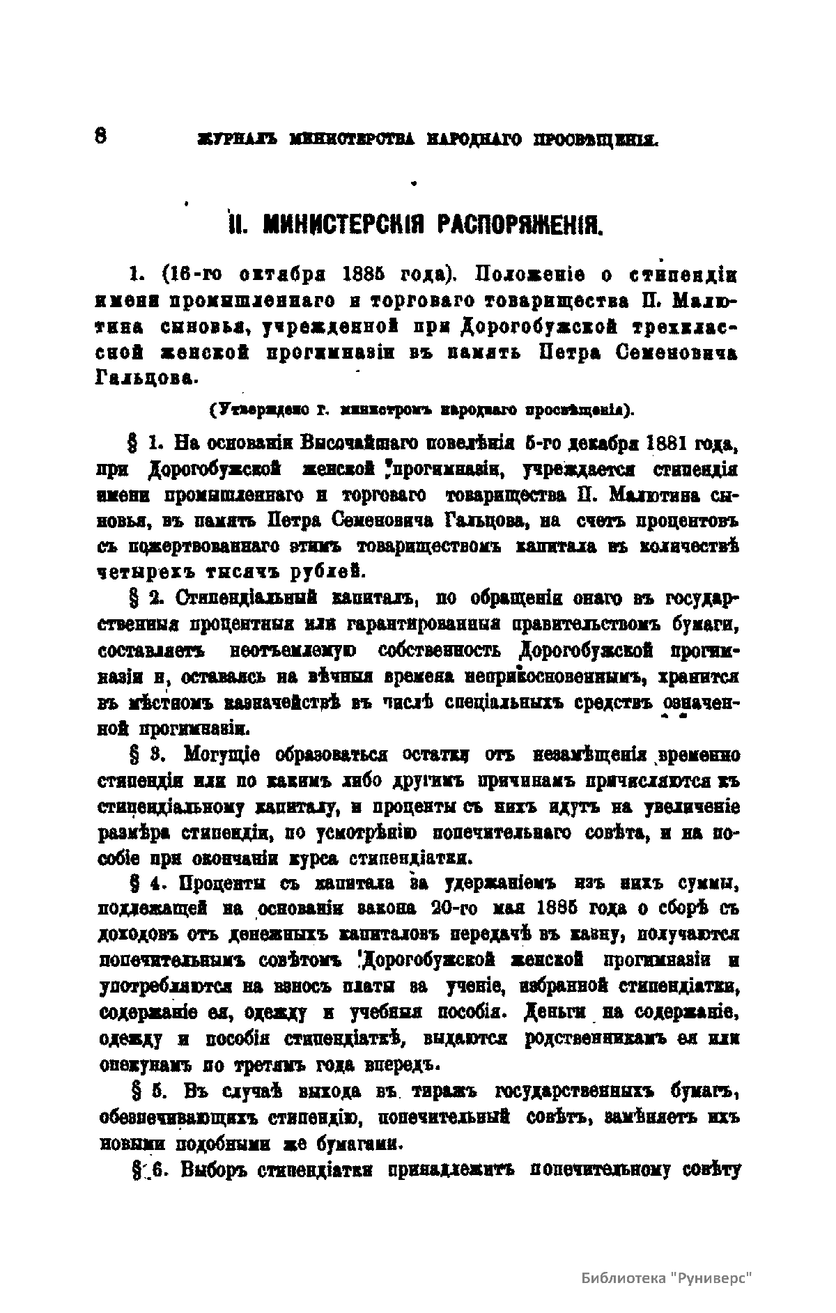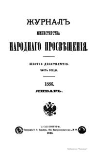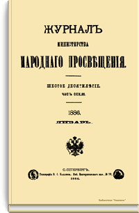 Журнал Министерства народного просвещения выходил с 1834-го по 1917 год. Официальный периодический журнал об успехах просвещения в России. Издатели журнала уверены в том, что «если для каждого человека необходим выход из грубой тьмы невежества и беспрерывное дальнейшее движение к свету, то для народов необходимо попечительное участие правительства в образовании. Только правительство имеет все средства знать и высоту успехов всемирного образования, и настоящие нужды Отечества».