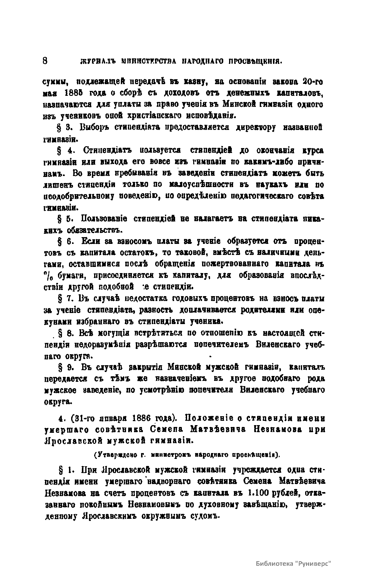 Журнал Министерства народного просвещения выходил с 1834-го по 1917 год. Официальный периодический журнал об успехах просвещения в России. Издатели журнала уверены в том, что «если для каждого человека необходим выход из грубой тьмы невежества и беспрерывное дальнейшее движение к свету, то для народов необходимо попечительное участие правительства в образовании. Только правительство имеет все средства знать и высоту успехов всемирного образования, и настоящие нужды Отечества».