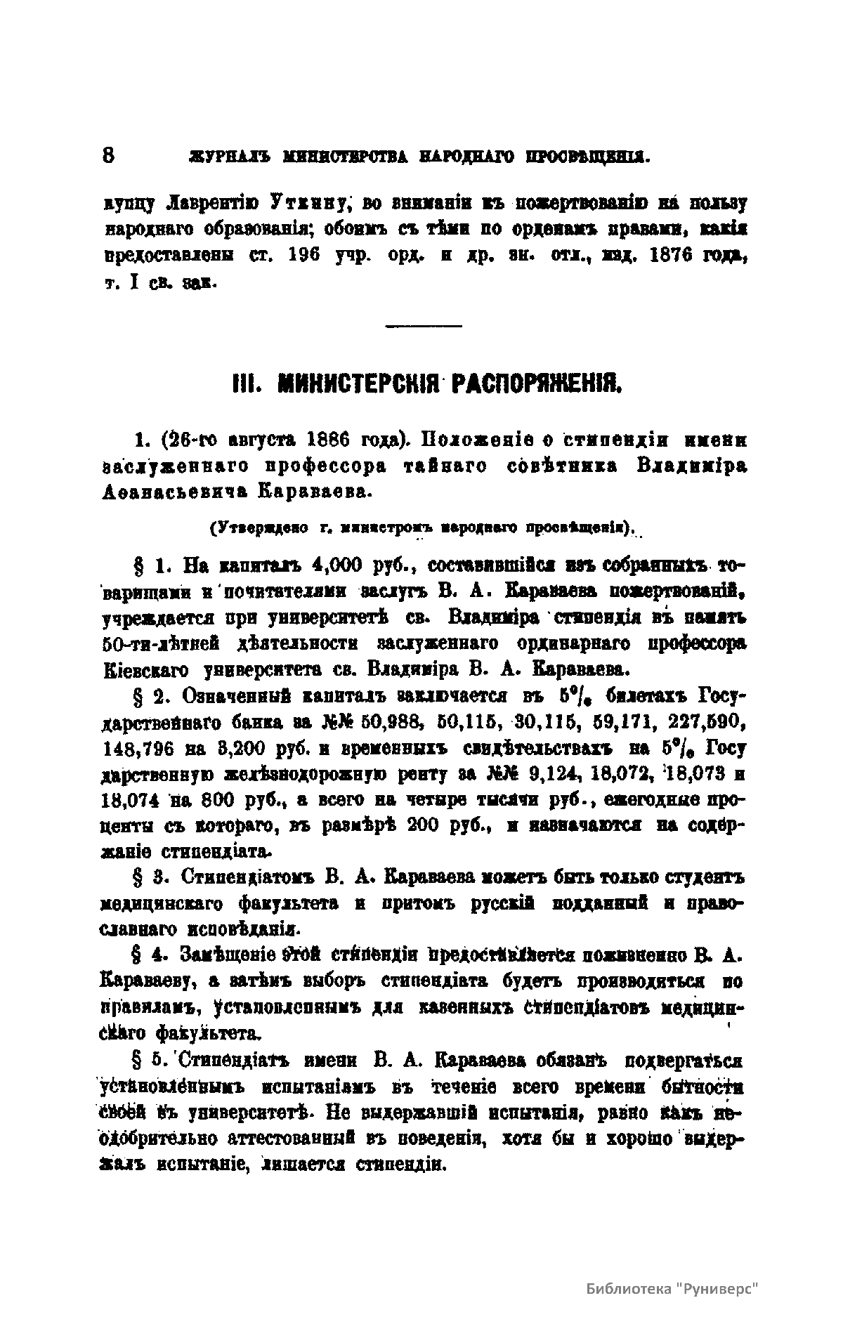 Журнал Министерства народного просвещения выходил с 1834-го по 1917 год. Официальный периодический журнал об успехах просвещения в России. Издатели журнала уверены в том, что «если для каждого человека необходим выход из грубой тьмы невежества и беспрерывное дальнейшее движение к свету, то для народов необходимо попечительное участие правительства в образовании. Только правительство имеет все средства знать и высоту успехов всемирного образования, и настоящие нужды Отечества».