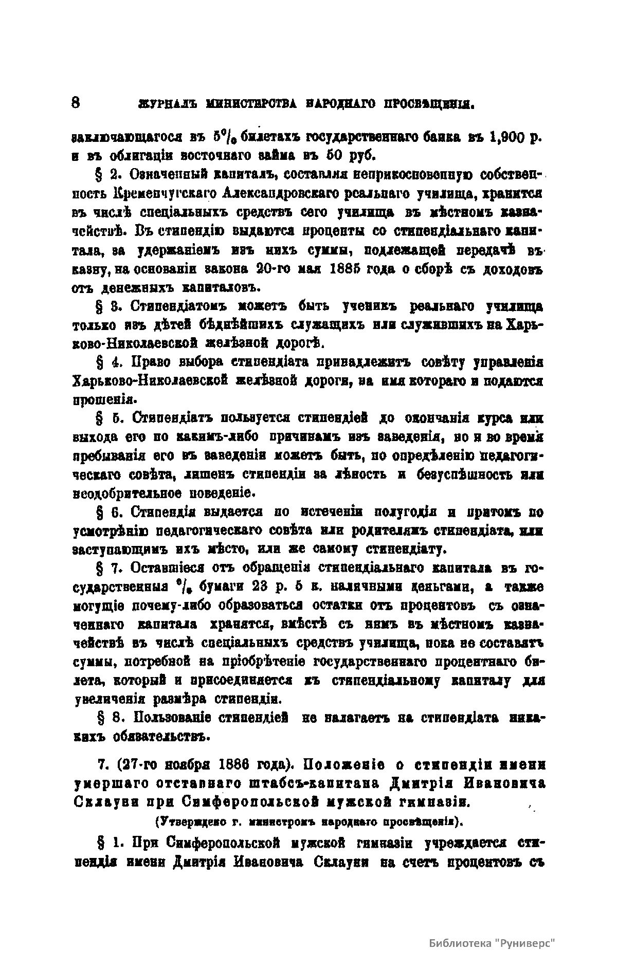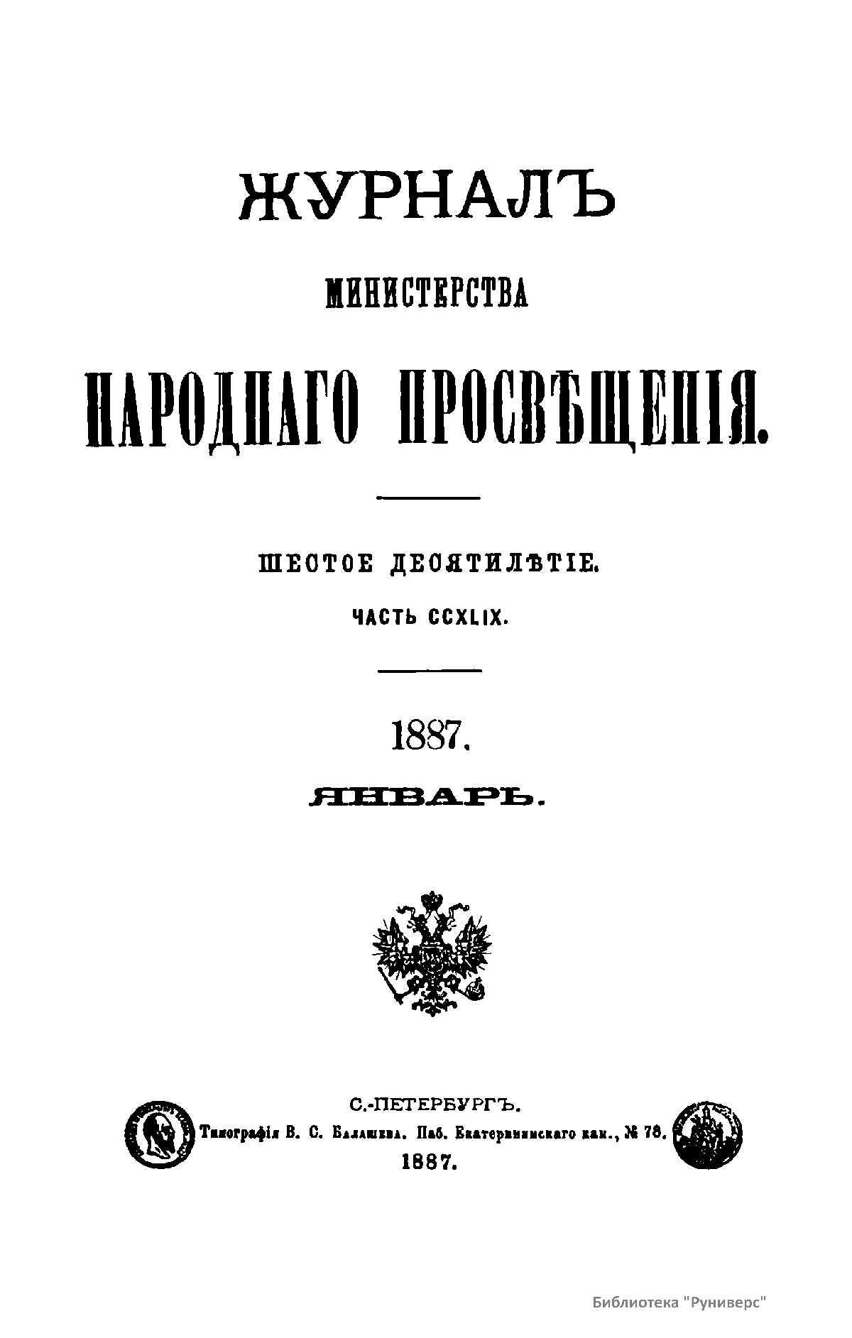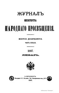 Журнал Министерства народного просвещения выходил с 1834-го по 1917 год. Официальный периодический журнал об успехах просвещения в России. Издатели журнала уверены в том, что «если для каждого человека необходим выход из грубой тьмы невежества и беспрерывное дальнейшее движение к свету, то для народов необходимо попечительное участие правительства в образовании. Только правительство имеет все средства знать и высоту успехов всемирного образования, и настоящие нужды Отечества».