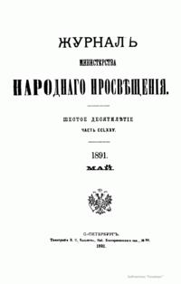 Журнал Министерства народного просвещения выходил с 1834-го по 1917 год. Официальный периодический журнал об успехах просвещения в России. Издатели журнала уверены в том, что «если для каждого человека необходим выход из грубой тьмы невежества и беспрерывное дальнейшее движение к свету, то для народов необходимо попечительное участие правительства в образовании. Только правительство имеет все средства знать и высоту успехов всемирного образования, и настоящие нужды Отечества».