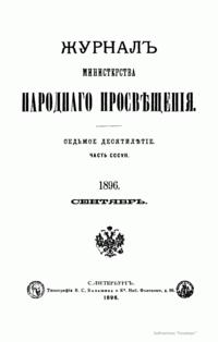 Журнал Министерства народного просвещения выходил с 1834-го по 1917 год. Официальный периодический журнал об успехах просвещения в России. Издатели журнала уверены в том, что «если для каждого человека необходим выход из грубой тьмы невежества и беспрерывное дальнейшее движение к свету, то для народов необходимо попечительное участие правительства в образовании. Только правительство имеет все средства знать и высоту успехов всемирного образования, и настоящие нужды Отечества».