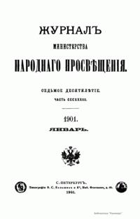 Журнал Министерства народного просвещения выходил с 1834-го по 1917 год. Официальный периодический журнал об успехах просвещения в России. Издатели журнала уверены в том, что «если для каждого человека необходим выход из грубой тьмы невежества и беспрерывное дальнейшее движение к свету, то для народов необходимо попечительное участие правительства в образовании. Только правительство имеет все средства знать и высоту успехов всемирного образования, и настоящие нужды Отечества».