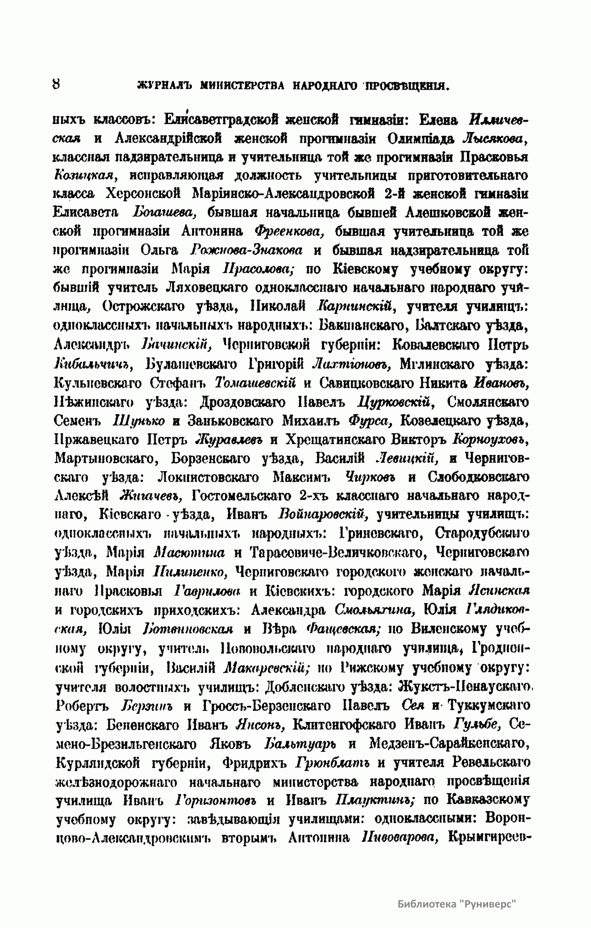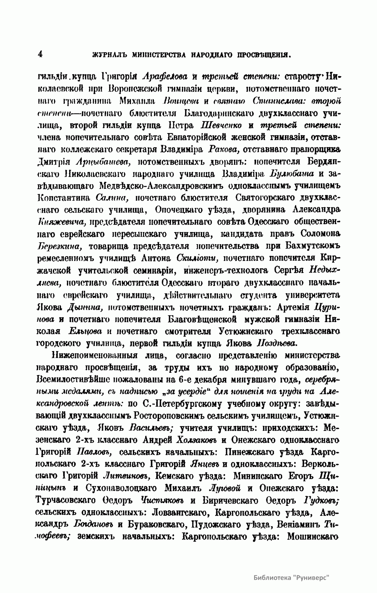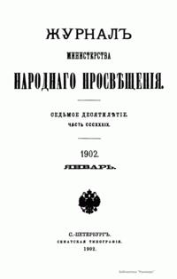 Журнал Министерства народного просвещения выходил с 1834-го по 1917 год. Официальный периодический журнал об успехах просвещения в России. Издатели журнала уверены в том, что «если для каждого человека необходим выход из грубой тьмы невежества и беспрерывное дальнейшее движение к свету, то для народов необходимо попечительное участие правительства в образовании. Только правительство имеет все средства знать и высоту успехов всемирного образования, и настоящие нужды Отечества».