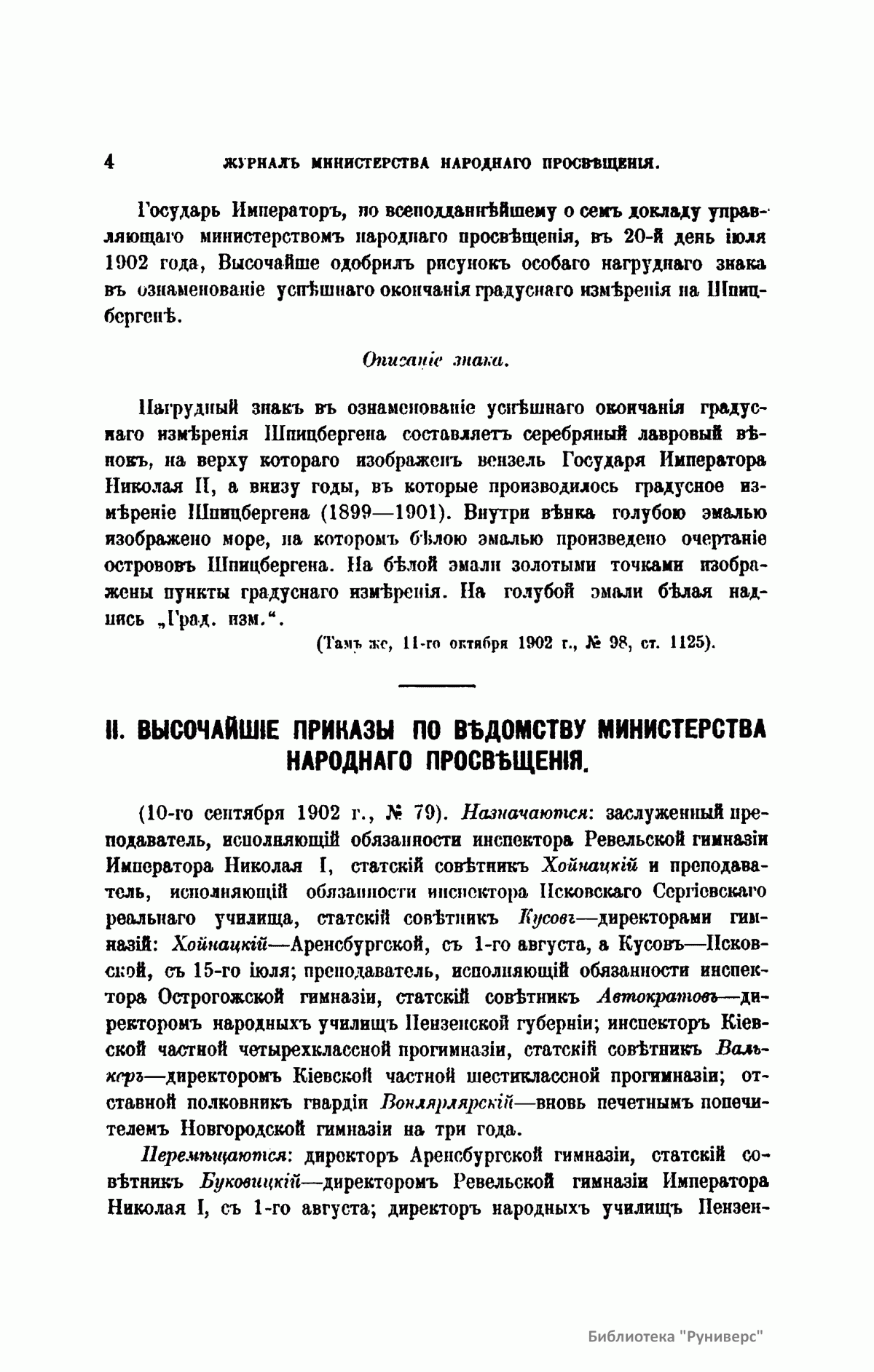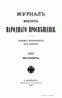 Журнал Министерства народного просвещения выходил с 1834-го по 1917 год. Официальный периодический журнал об успехах просвещения в России. Издатели журнала уверены в том, что «если для каждого человека необходим выход из грубой тьмы невежества и беспрерывное дальнейшее движение к свету, то для народов необходимо попечительное участие правительства в образовании. Только правительство имеет все средства знать и высоту успехов всемирного образования, и настоящие нужды Отечества».