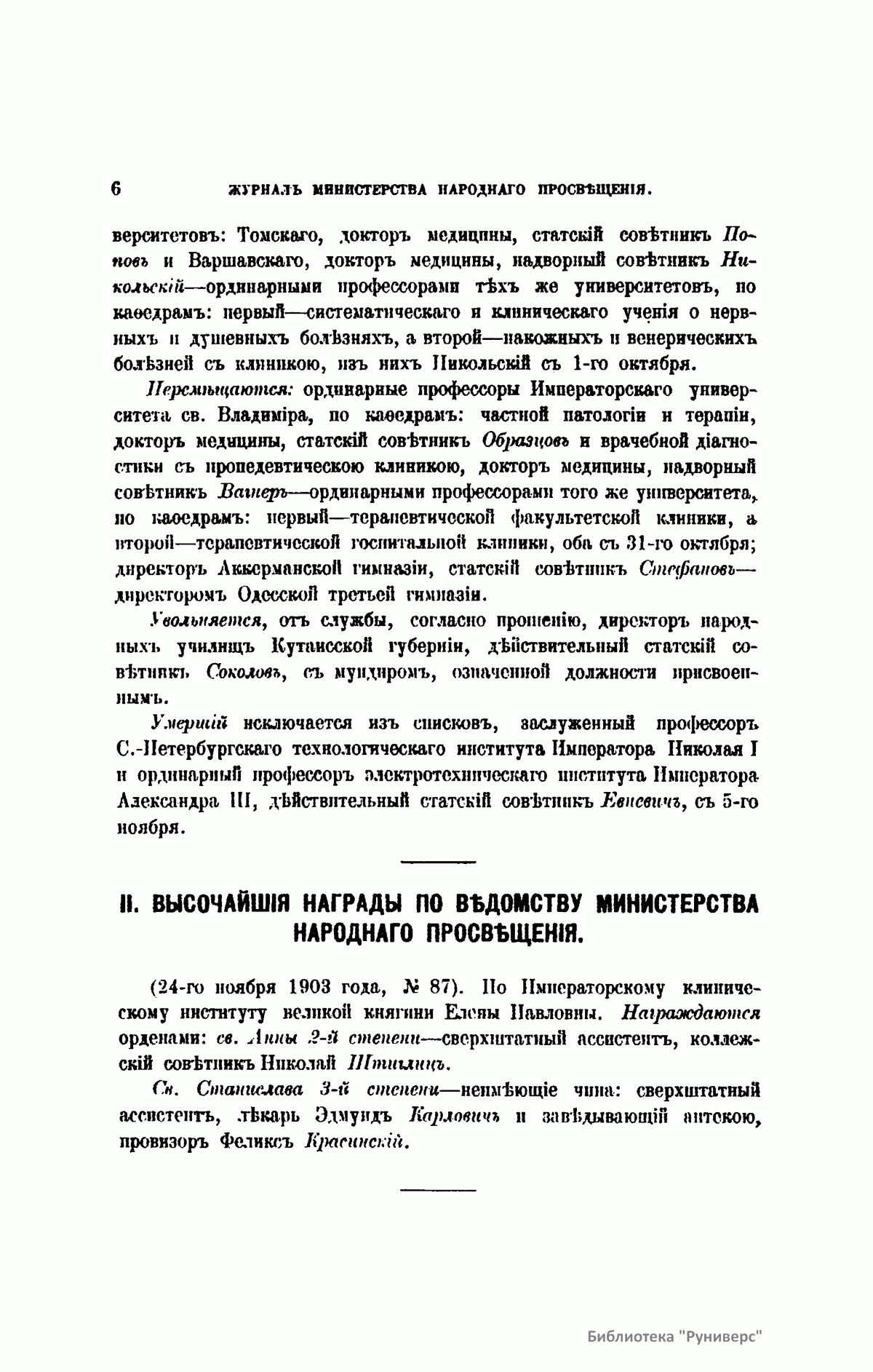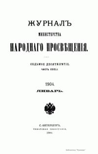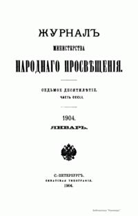 Журнал Министерства народного просвещения выходил с 1834-го по 1917 год. Официальный периодический журнал об успехах просвещения в России. Издатели журнала уверены в том, что «если для каждого человека необходим выход из грубой тьмы невежества и беспрерывное дальнейшее движение к свету, то для народов необходимо попечительное участие правительства в образовании. Только правительство имеет все средства знать и высоту успехов всемирного образования, и настоящие нужды Отечества».