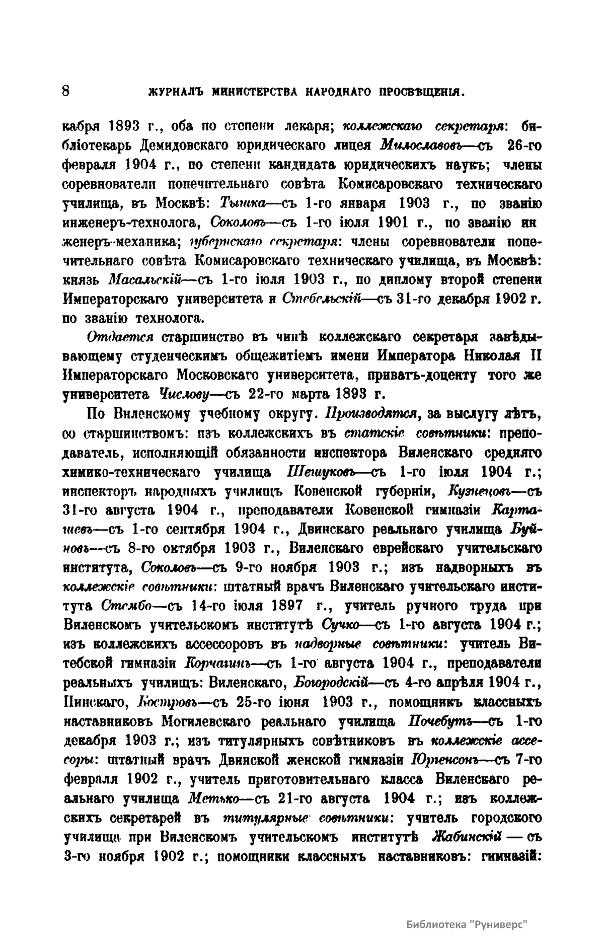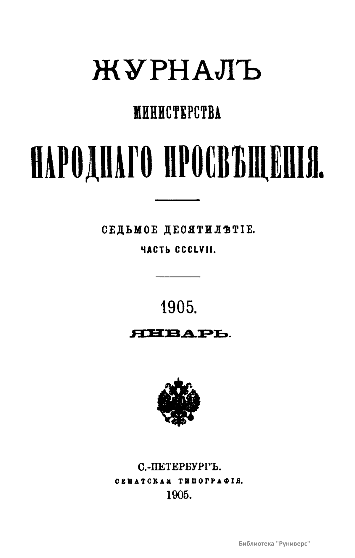 Журнал Министерства народного просвещения выходил с 1834-го по 1917 год. Официальный периодический журнал об успехах просвещения в России. Издатели журнала уверены в том, что «если для каждого человека необходим выход из грубой тьмы невежества и беспрерывное дальнейшее движение к свету, то для народов необходимо попечительное участие правительства в образовании. Только правительство имеет все средства знать и высоту успехов всемирного образования, и настоящие нужды Отечества».