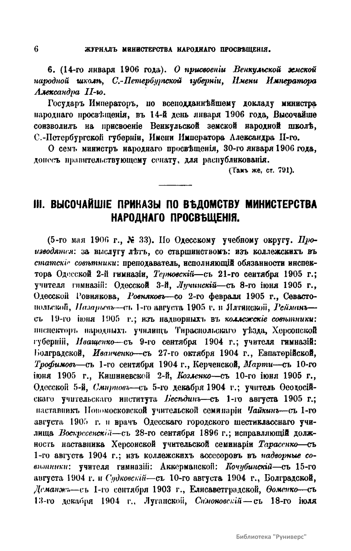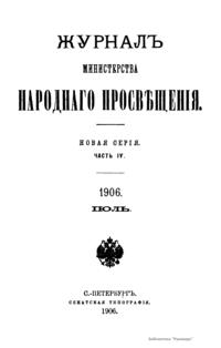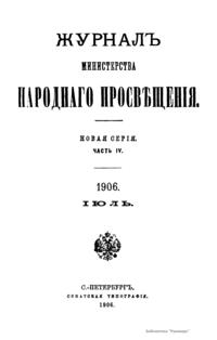 Журнал Министерства народного просвещения выходил с 1834-го по 1917 год. Официальный периодический журнал об успехах просвещения в России. Издатели журнала уверены в том, что «если для каждого человека необходим выход из грубой тьмы невежества и беспрерывное дальнейшее движение к свету, то для народов необходимо попечительное участие правительства в образовании. Только правительство имеет все средства знать и высоту успехов всемирного образования, и настоящие нужды Отечества».